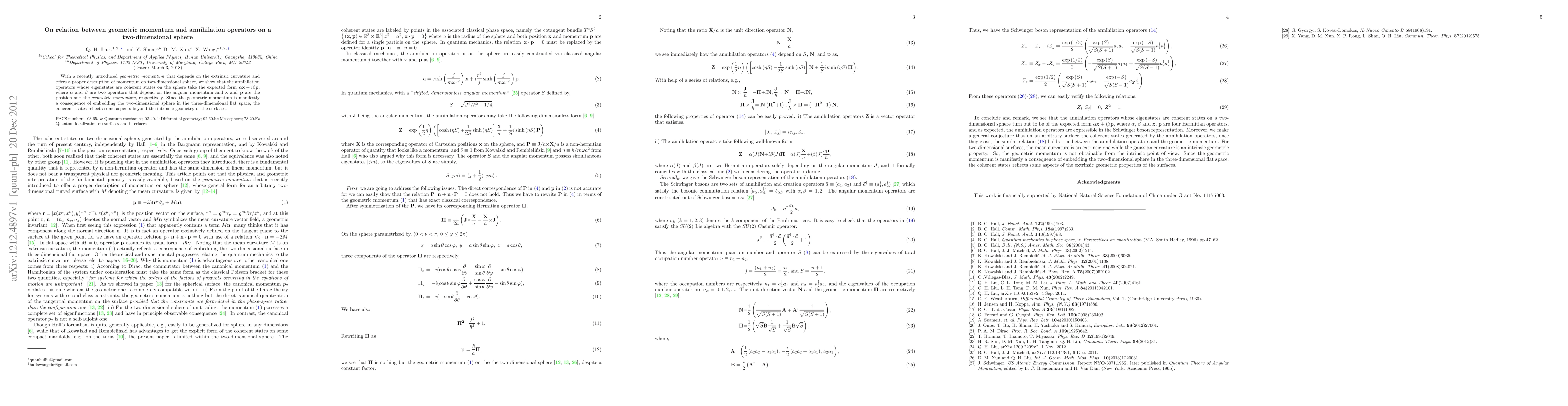 With a recently introduced geometric momentum that depends on the extrinsic curvature and offers a proper description of momentum on two-dimensional sphere, we show that the annihilation operators whose eigenstates are coherent states on the sphere take the expected form {\alpha}x+i{\beta}p, where {\alpha} and {\beta} are two operators that depend on the angular momentum and x and p are the position and the geometric momentum, respectively. Since the geometric momentum is manifestly a consequence of embedding the two-dimensional sphere in the three-dimensional flat space, the coherent states reflects some aspects beyond the intrinsic geometry of the surfaces.