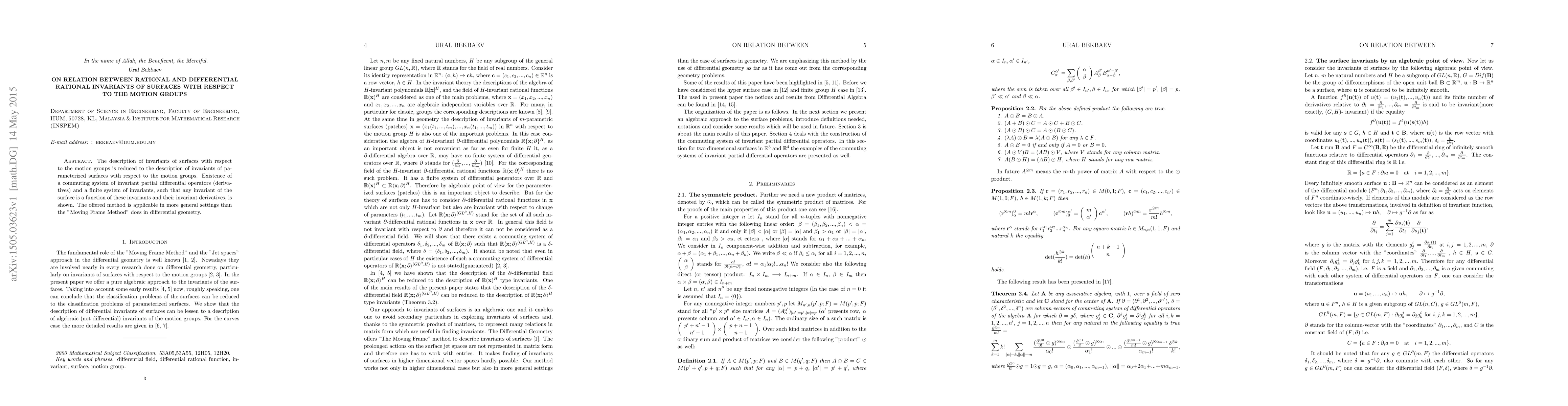 This paper explores the relationship between rational and differential rational invariants of surfaces under motion groups, demonstrating a method that reduces the problem to parameterized surfaces. The authors show the existence of a system of invariant differential operators and a finite set of invariants, applicable in broader contexts than the traditional Moving Frame Method.