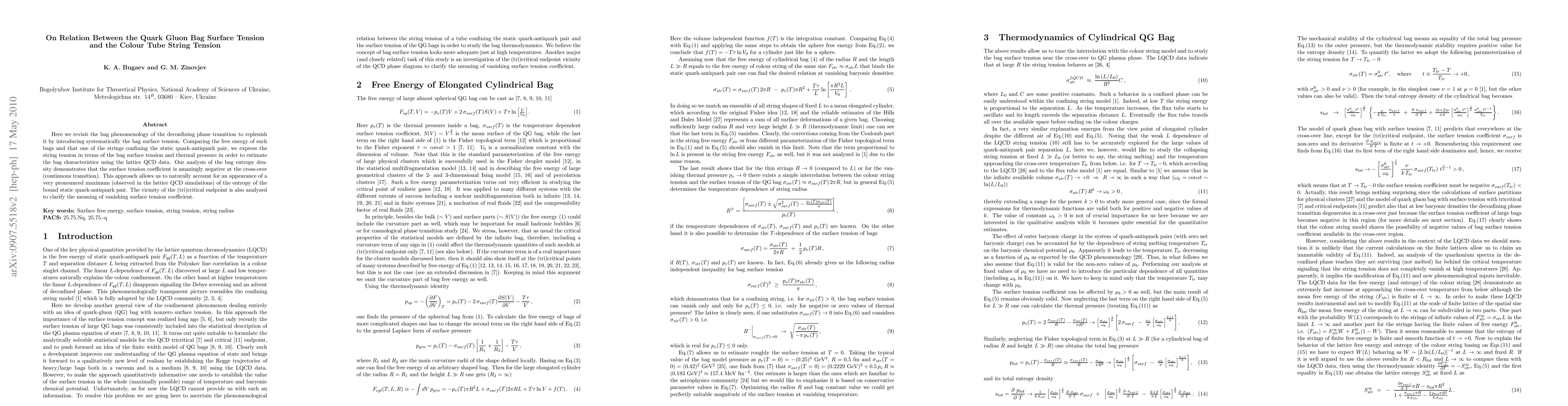 Here we revisit the bag phenomenology of the deconfining phase transition to replenish it by introducing systematically the bag surface tension. Comparing the free energy of such bags and that one of the strings confining the static quark-antiquark pair, we express the string tension in terms of the bag surface tension and thermal pressure in order to estimate the bag characteristics using the lattice QCD data. Our analysis of the bag entropy density demonstrates that the surface tension coefficient is amazingly negative at the cross-over (continuous transition). This approach allows us to naturally account for an appearance of a very pronounced maximum (observed in the lattice QCD simulations) of the entropy of the bound static quark-antiquark pair. The vicinity of the (tri)critical endpoint is also analyzed to clarify the meaning of vanishing surface tension coefficient.