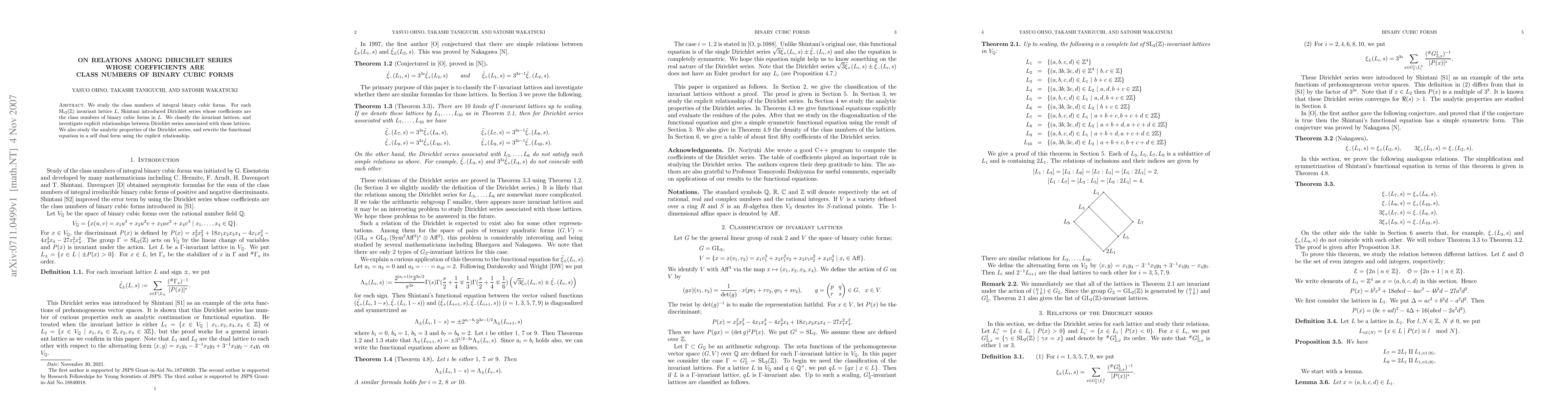 This paper classifies invariant lattices associated with binary cubic forms and investigates relationships between Dirichlet series whose coefficients are their class numbers. It also explores the analytic properties of these series and presents a self-dual functional equation.