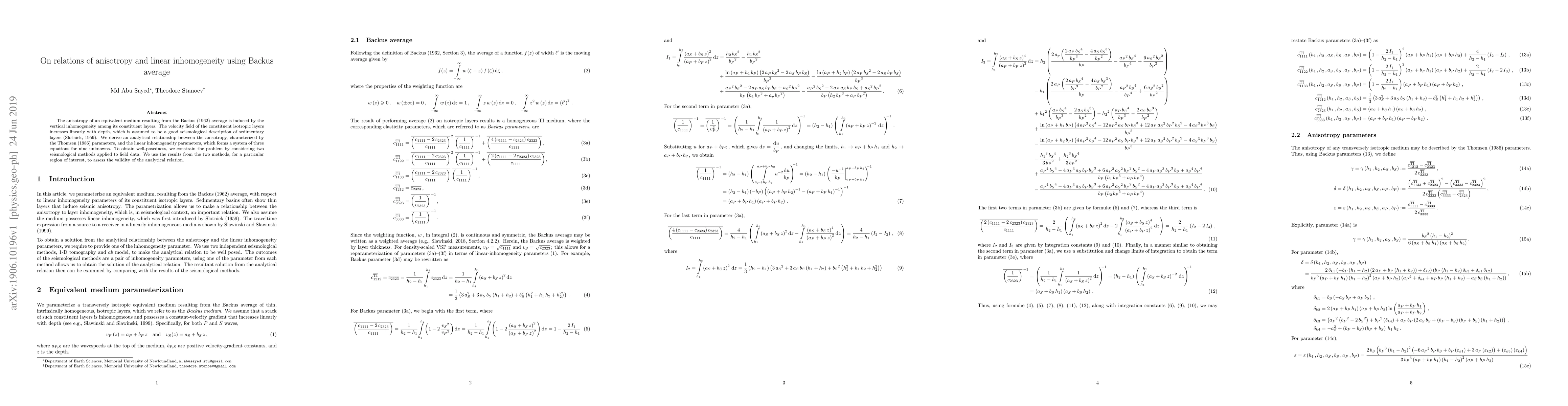 The anisotropy of an equivalent medium resulting from the Backus (1962) average is induced by the vertical inhomogeneity among its constituent layers. The velocity field of the constituent isotropic layers increases linearly with depth, which is assumed to be a good seismological description of sedimentary layers Slotnick (1959). We derive an analytical relationship between the anisotropy, characterized by the Thomsen (1986) parameters, and the linear inhomogeneity parameters, which forms a system of three equations for nine unknowns. To obtain well-posedness, we constrain the problem by considering two seismological methods applied to field data. We use the results from the two methods, for a particular region of interest, to assess the validity of the analytical relation.