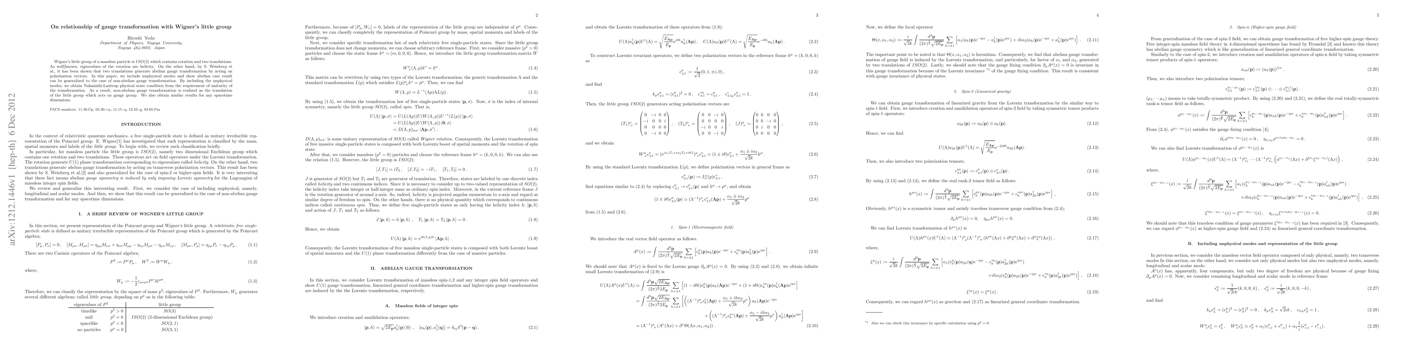 This paper explores the relationship between gauge transformations and Wigner's little group for massless particles, demonstrating that non-abelian gauge transformations can be viewed as translations within the little group that act on the gauge group, with results generalized across various spacetime dimensions. The study incorporates unphysical modes to derive the Nakanishi-Lautrup condition for unitarity.