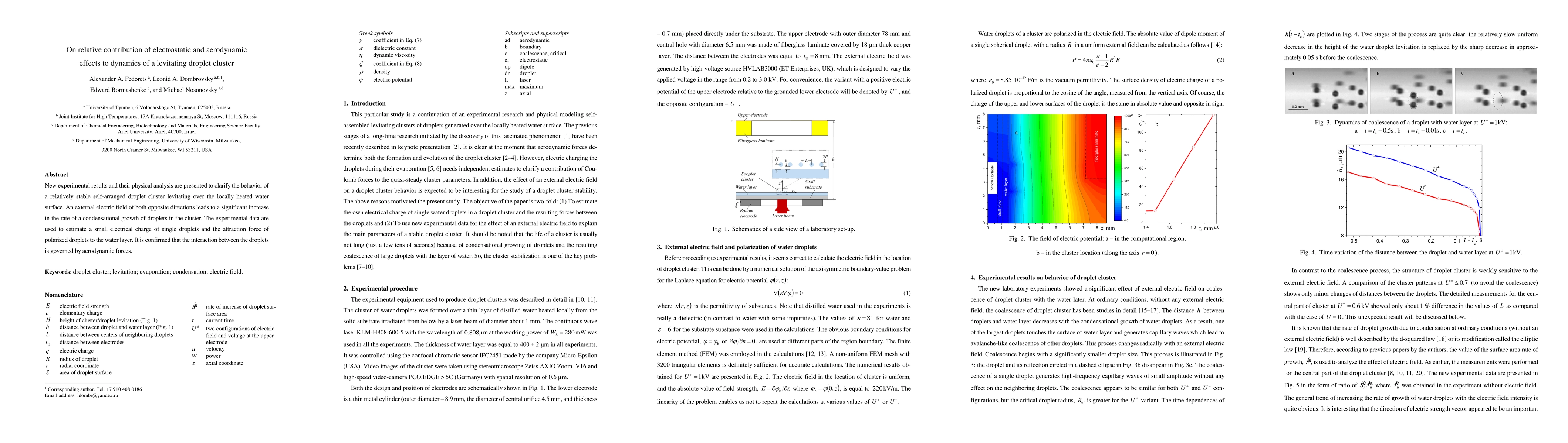 This paper investigates the dynamics of a levitating droplet cluster over a heated water surface, revealing that electrostatic and aerodynamic effects significantly influence its behavior. Experimental results show that an external electric field enhances condensational growth, while aerodynamic forces dominate the interaction between droplets.