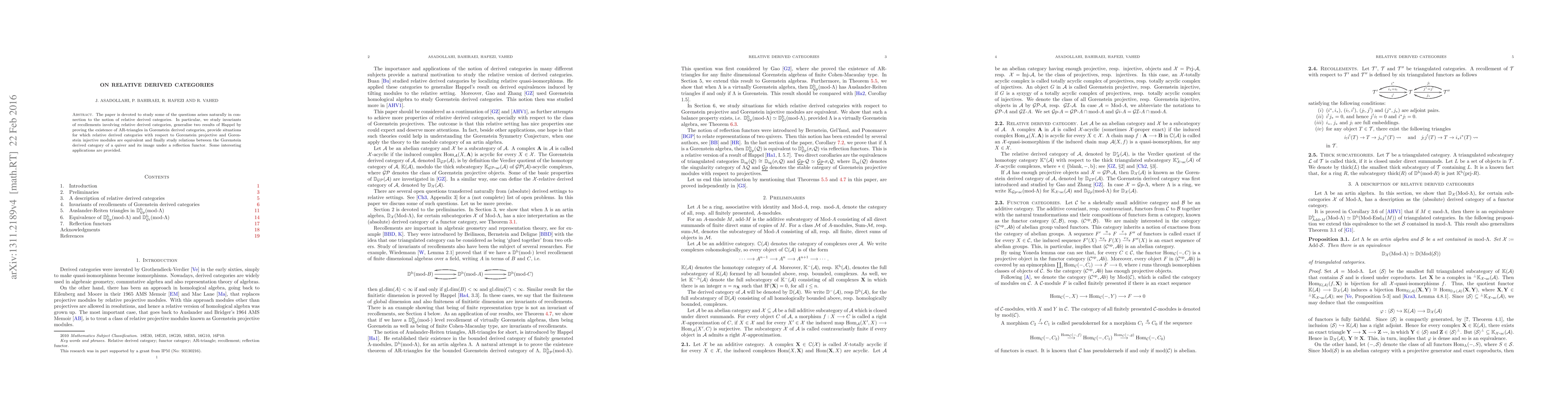The paper is devoted to study some of the questions arises naturally in connection to the notion of relative derived categories. In particular, we study invariants of recollements involving relative derived categories, generalise two results of Happel by proving the existence of AR-triangles in Gorenstein derived categories, provide situations for which relative derived categories with respect to Gorenstein projective and Gorenstein injective modules are equivalent and finally study relations between the Gorenstein derived category of a quiver and its image under a reflection functor. Some interesting applications are provided.