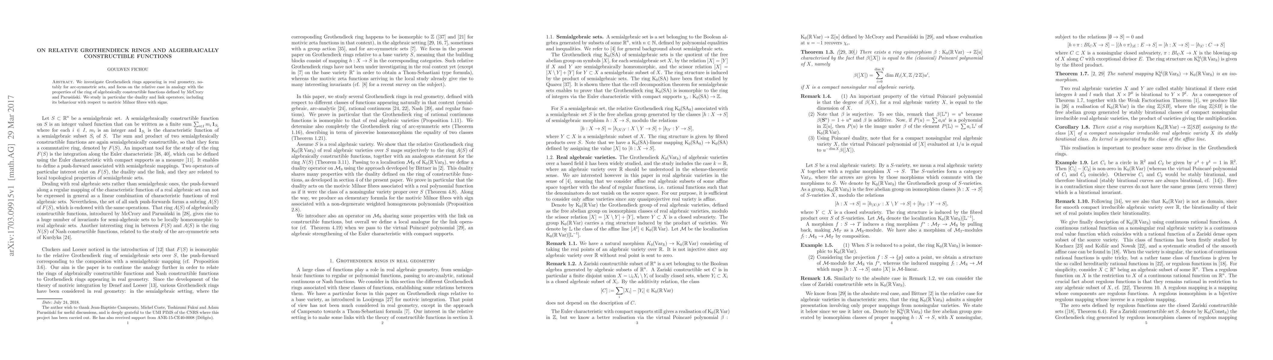 This paper explores Grothendieck rings in real geometry, specifically for arc-symmetric sets, and examines their relative properties akin to algebraically constructible functions. It investigates duality and link operators, especially concerning motivic Milnor fibres with signed interactions.