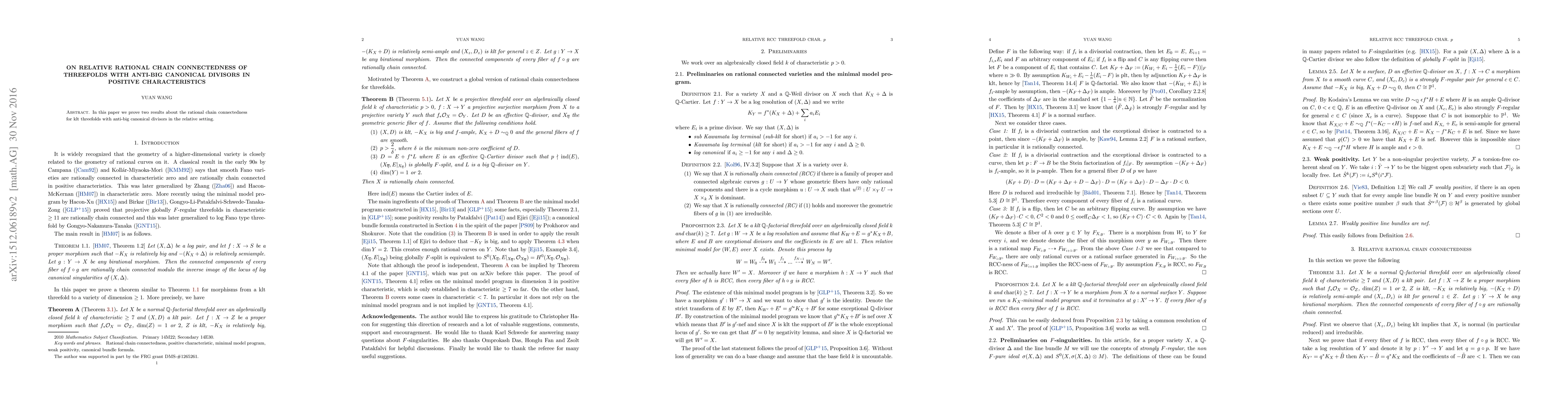 Summary: This paper establishes two results regarding the rational chain connectedness of klt threefolds with anti-big canonical divisors in a relative setting, contributing to the understanding of their geometric properties in positive characteristics.