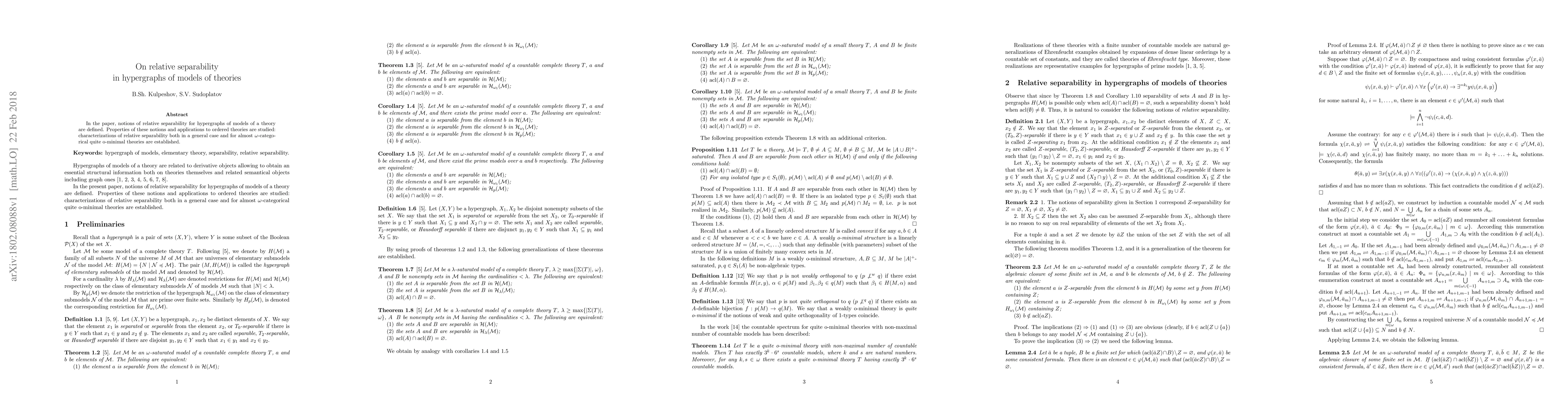In the paper, notions of relative separability for hypergraphs of models of a theory are defined. Properties of these notions and applications to ordered theories are studied: characterizations of relative separability both in a general case and for almost countably categorical quite o-minimal theories are established.
