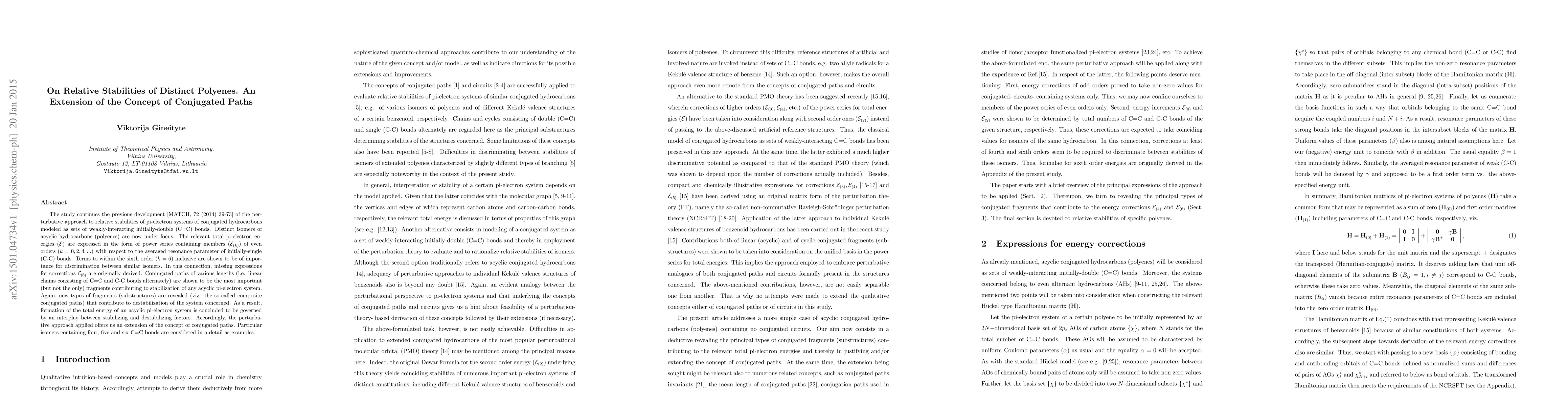 The study continues the previous development [MATCH, 72 (2014) 39-73] of the perturbative approach to relative stabilities of pi-electron systems of conjugated hydrocarbons modeled as sets of weakly-interacting initially-double (C=C) bonds. Distinct isomers of acyclic hydrocarbons (polyenes) are now under focus. The relevant total pi-electron energies (E) are expressed in the form of power series containing members (E_(k)) of even orders (k=0,2,4,...) with respect to the averaged resonance parameter of initially-single (C-C) bonds. Terms to within the sixth order (k=6) inclusive are shown to be of importance for discrimination between similar isomers. In this connection, missing expressions for corrections E_(6) are originally derived. Conjugated paths of various lengths (i.e. linear chains consisting of C=C and C-C bonds alternately) are shown to be the most important (but not the only) fragments contributing to stabilization of any acyclic pi-electron system. Again, new types of fragments (substructures) are revealed (viz. the so-called composite conjugated paths) that contribute to destabilization of the system concerned. As a result, formation of the total energy of an acyclic pi-electron system is concluded to be governed by an interplay between stabilizing and destabilizing factors. Accordingly, the perturbative approach applied offers us an extension of the concept of conjugated paths. Particular isomers containing four, five and six C=C bonds are considered in a detail as examples.