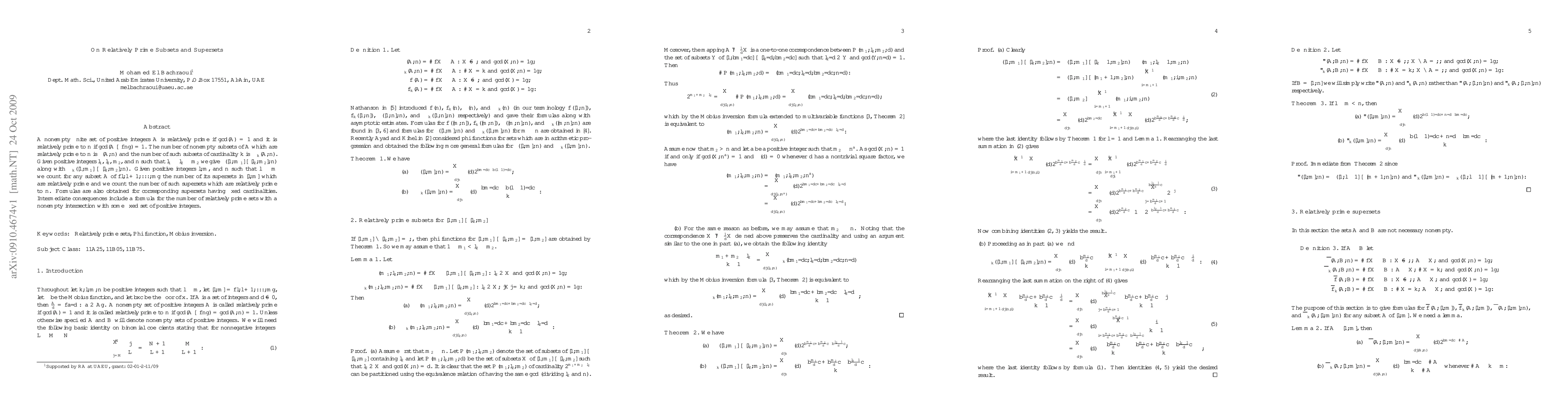 This paper investigates the count of nonempty subsets of a given set of positive integers that are relatively prime to a specified integer n, including those with specific cardinalities. It also explores the number of supersets of subsets within a given range that maintain relative primality to n, providing formulas for both general and fixed-cardinality cases.