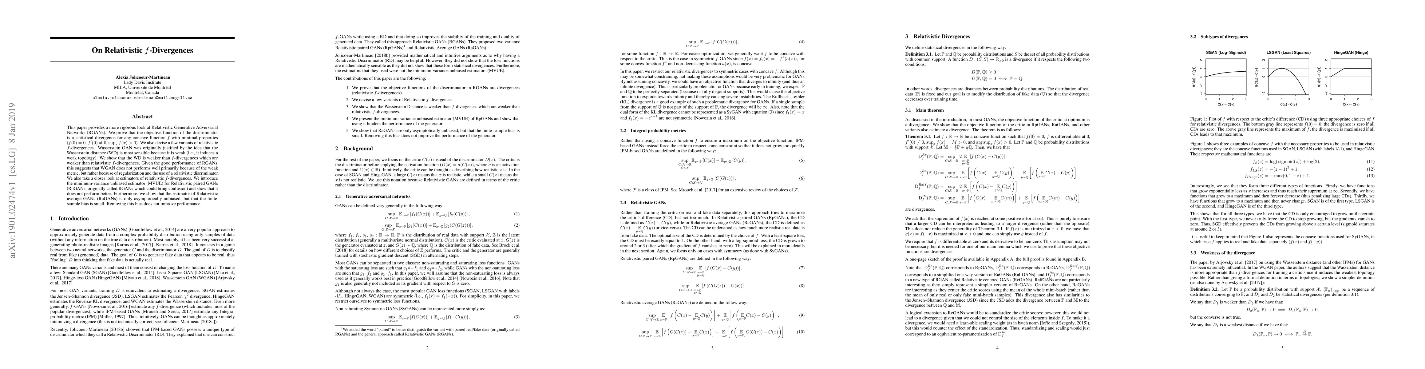 This paper provides a more rigorous look at Relativistic Generative Adversarial Networks (RGANs). We prove that the objective function of the discriminator is a statistical divergence for any concave function $f$ with minimal properties ($f(0)=0$, $f'(0) \neq 0$, $\sup_x f(x)>0$). We also devise a few variants of relativistic $f$-divergences. Wasserstein GAN was originally justified by the idea that the Wasserstein distance (WD) is most sensible because it is weak (i.e., it induces a weak topology). We show that the WD is weaker than $f$-divergences which are weaker than relativistic $f$-divergences. Given the good performance of RGANs, this suggests that WGAN does not performs well primarily because of the weak metric, but rather because of regularization and the use of a relativistic discriminator. We also take a closer look at estimators of relativistic $f$-divergences. We introduce the minimum-variance unbiased estimator (MVUE) for Relativistic paired GANs (RpGANs; originally called RGANs which could bring confusion) and show that it does not perform better. Furthermore, we show that the estimator of Relativistic average GANs (RaGANs) is only asymptotically unbiased, but that the finite-sample bias is small. Removing this bias does not improve performance.