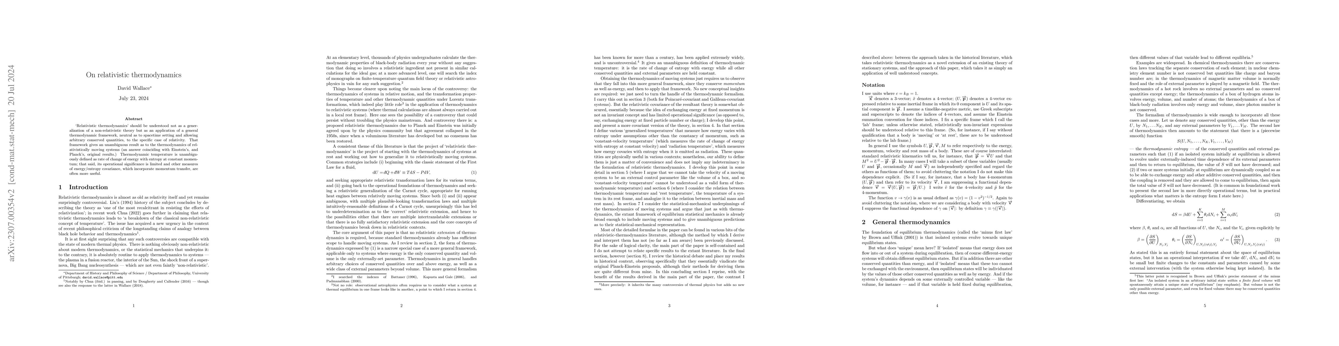 I revisit the long-running controversy as to the transformation properties of temperature under Lorentz transformations, and argue that, contrary to widespread views in some parts of the literature, `relativistic thermodynamics' should not be understood as a generalization to relativistic physics of an initially non-relativistic theory but as an application of a general thermodynamic framework, neutral as to its spacetime setting, to the specific case of relativity. More specifically, I observe that the general framework of equilibrium thermodynamics incorporates arbitrary conserved quantities in addition to energy and that when that framework is applied to systems in which momentum is conserved and can be transferred between systems, it gives rise to an unambiguous result as to the thermodynamics of moving (including relativistically moving) systems. This leads to an equally unambiguous prediction as to how thermodynamic temperature transforms under Lorentz transformations (an answer coinciding with Einstein's, and Planck's, original results.) That said, one can identify within this framework other quantities which play a temperature-like role and have different transformation properties; at some level it is a matter of convention and semantics which is `the' temperature. I conclude with some brief remarks about the situation in general relativity.