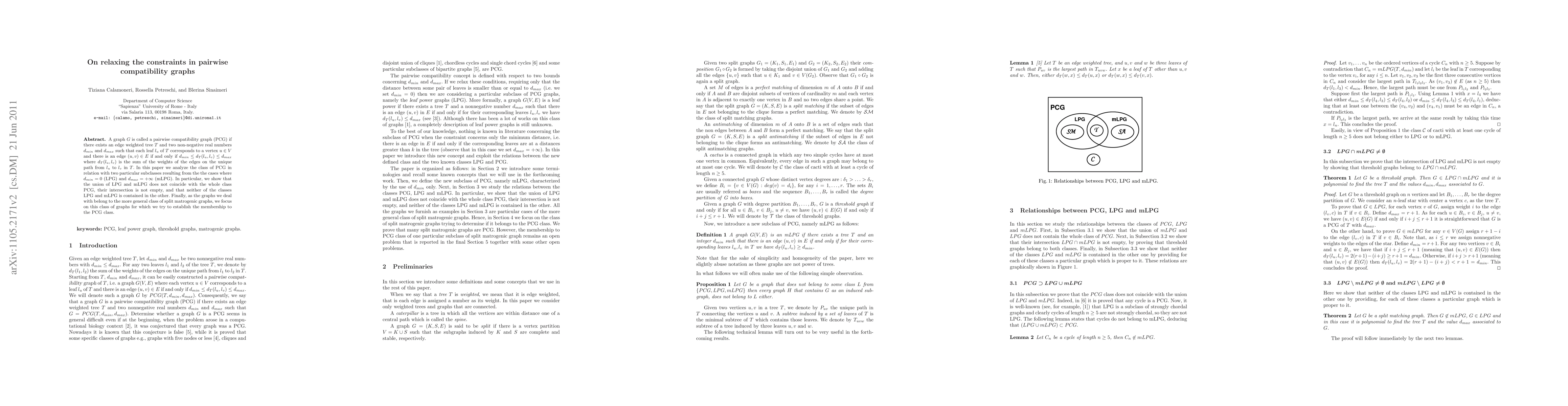 A graph $G$ is called a pairwise compatibility graph (PCG) if there exists an edge weighted tree $T$ and two non-negative real numbers $d_{min}$ and $d_{max}$ such that each leaf $l_u$ of $T$ corresponds to a vertex $u \in V$ and there is an edge $(u,v) \in E$ if and only if $d_{min} \leq d_T (l_u, l_v) \leq d_{max}$ where $d_T (l_u, l_v)$ is the sum of the weights of the edges on the unique path from $l_u$ to $l_v$ in $T$. In this paper we analyze the class of PCG in relation with two particular subclasses resulting from the the cases where $\dmin=0$ (LPG) and $\dmax=+\infty$ (mLPG). In particular, we show that the union of LPG and mLPG does not coincide with the whole class PCG, their intersection is not empty, and that neither of the classes LPG and mLPG is contained in the other. Finally, as the graphs we deal with belong to the more general class of split matrogenic graphs, we focus on this class of graphs for which we try to establish the membership to the PCG class.