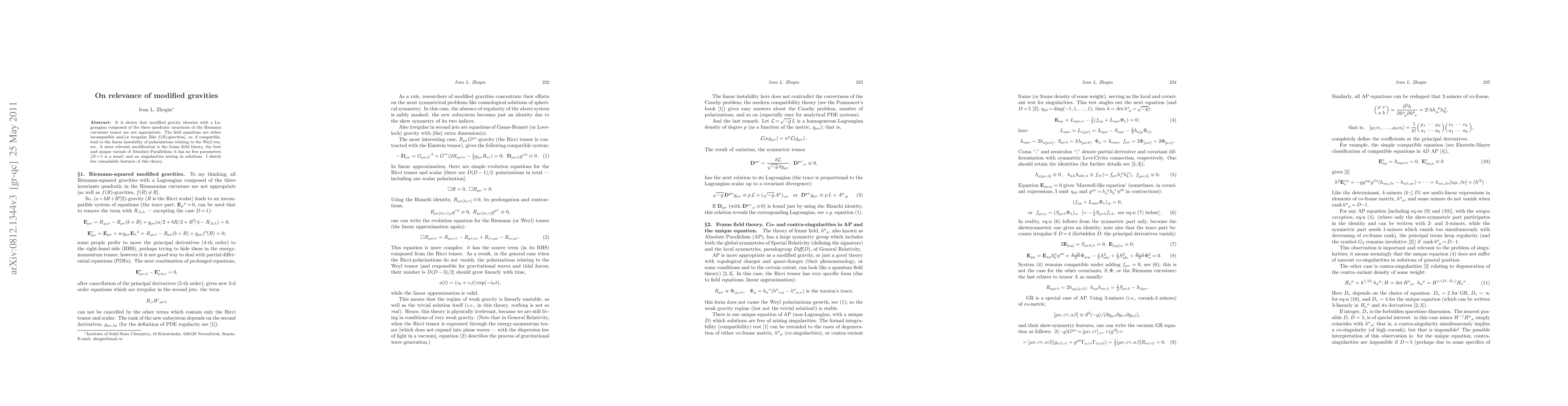 It is shown that modified gravity theories with a Lagrangian composed of the three quadratic invariants of the Riemann curvature tensor are not appropriate. The field equations are either incompatible and/or irregular [like f(R)-gravities], or, if compatible, lead to the linear instability of polarizations relating to the Weyl tensor. A more relevant modification is the frame field theory, namely the best and unique variant of Absolute Parallelism; it has no free parameters (D=5 is a must) and no singularities arising in solutions. I sketch few remarkable features of this theory.