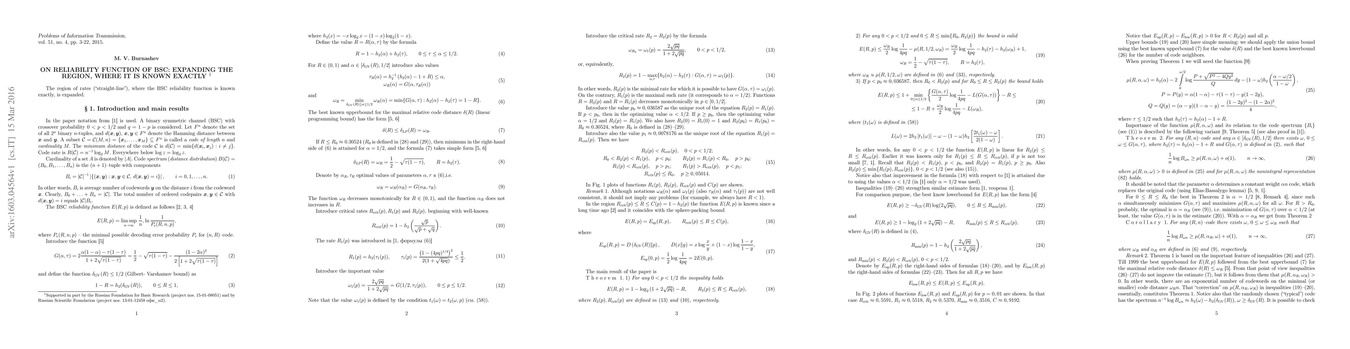 The region of rates ("straight-line"), where the BSC reliability function is known exactly, is expanded.