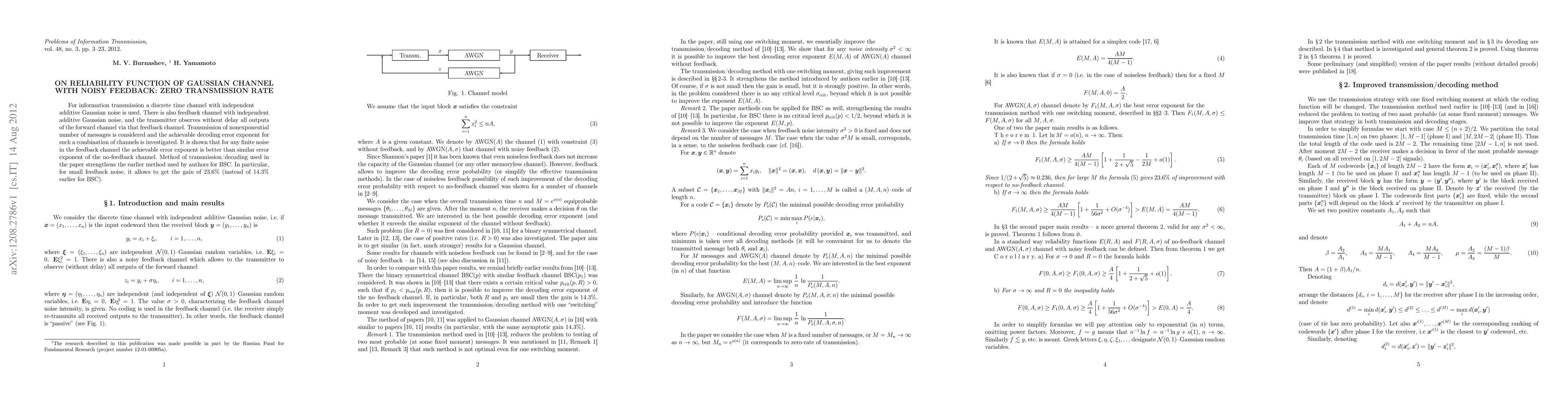 This paper investigates the reliability function of a discrete time Gaussian channel with noisy feedback, demonstrating that the achievable decoding error exponent is better than that of a no-feedback channel, even with finite noise in the feedback channel. The method used achieves a 23.6% gain over previous results for Binary Symmetric Channels (BSC).