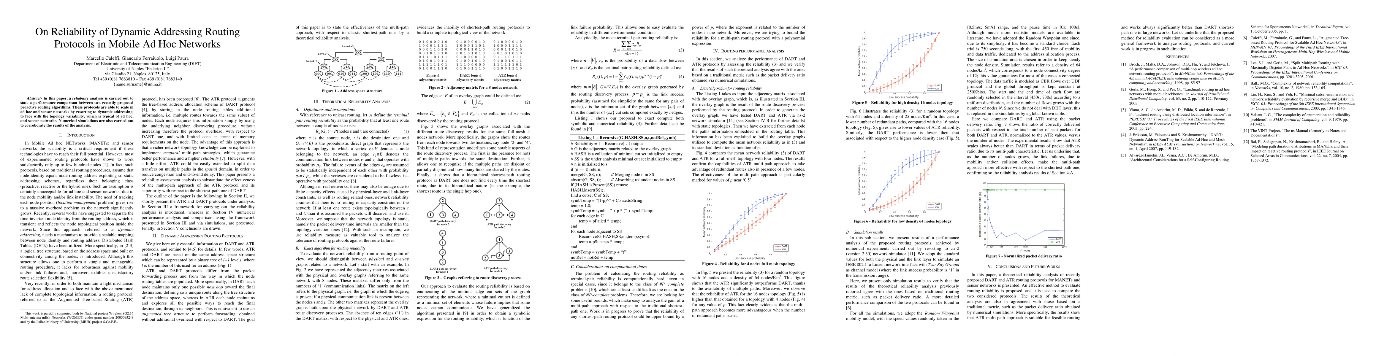 In this paper, a reliability analysis is carried out to state a performance comparison between two recently proposed proactive routing algorithms. These protocols are able to scale in ad hoc and sensor networks by resorting to dynamic addressing, to face with the topology variability, which is typical of ad hoc, and sensor networks. Numerical simulations are also carried out to corroborate the results of the analysis.