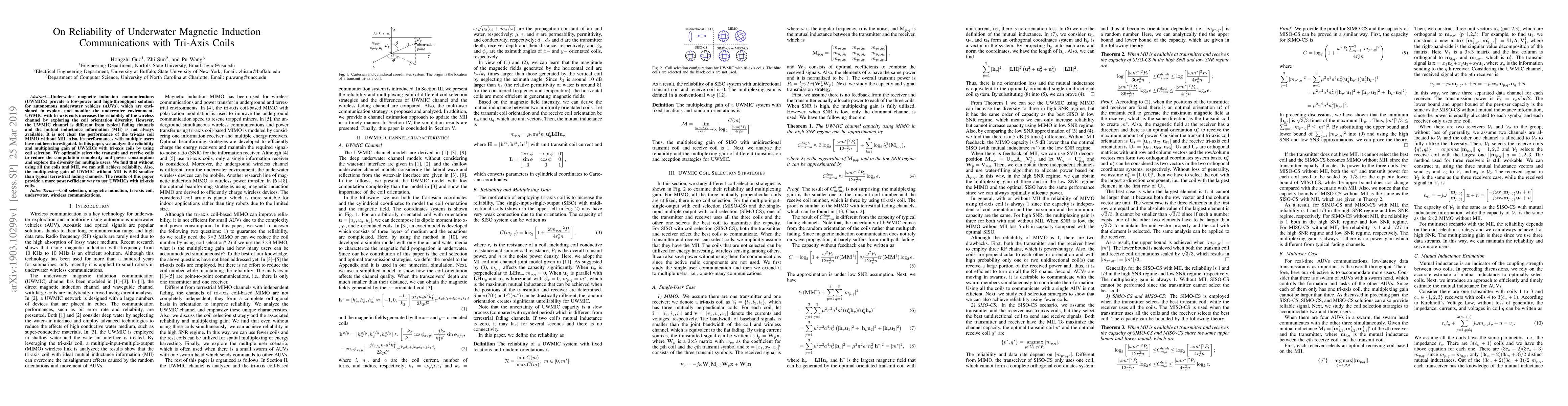 This paper analyzes the reliability and multiplexing gain of underwater magnetic induction communications (UWMICs) using tri-axis coils, finding that optimal coil selection can achieve reliability without full mutual inductance information (MII). The study reveals a 5dB reduction in multiplexing gain compared to terrestrial channels but offers a more power-efficient method for UWMICs.