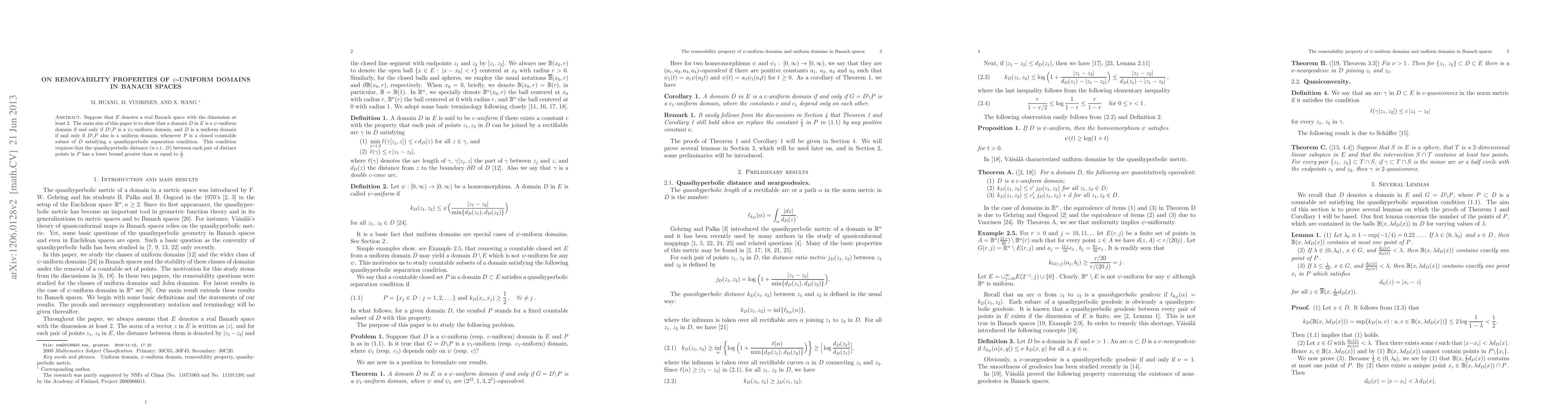 Suppose that $E$ denotes a real Banach space with the dimension at least 2. The main aim of this paper is to show that a domain $D$ in $E$ is a $\psi$-uniform domain if and only if $D\backslash P$ is a $\psi_1$-uniform domain, and $D$ is a uniform domain if and only if $D\backslash P$ also is a uniform domain, whenever $P$ is a closed countable subset of $D$ satisfying a quasihyperbolic separation condition. This condition requires that the quasihyperbolic distance (w.r.t. $D$) between each pair of distinct points in $P$ has a lower bound greater than or equal to $\frac{1}{2}$.