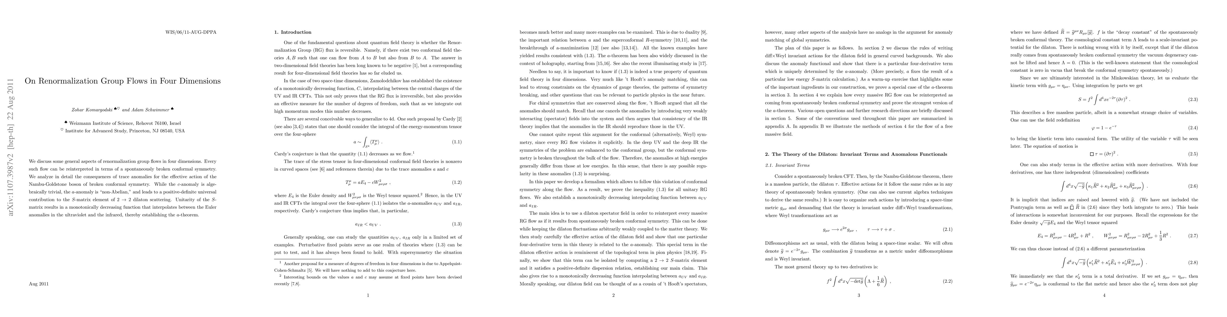 We discuss some general aspects of renormalization group flows in four dimensions. Every such flow can be reinterpreted in terms of a spontaneously broken conformal symmetry. We analyze in detail the consequences of trace anomalies for the effective action of the Nambu-Goldstone boson of broken conformal symmetry. While the c-anomaly is algebraically trivial, the a-anomaly is "non-Abelian," and leads to a positive-definite universal contribution to the S-matrix of 2->2 dilaton scattering. Unitarity of the S-matrix results in a monotonically decreasing function that interpolates between the Euler anomalies in the ultraviolet and the infrared, thereby establishing the a-theorem.