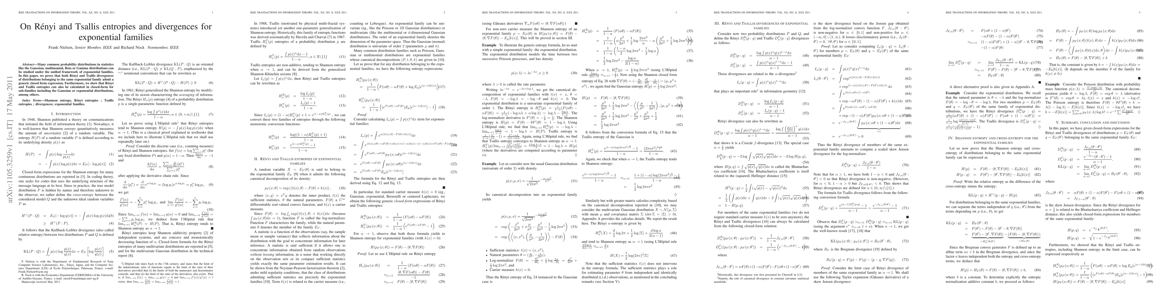 This paper shows that Renyi and Tsallis entropies can be calculated in closed-form for distributions within the same exponential family, including Gaussian and Gamma distributions, offering a unified framework for statistical analysis.