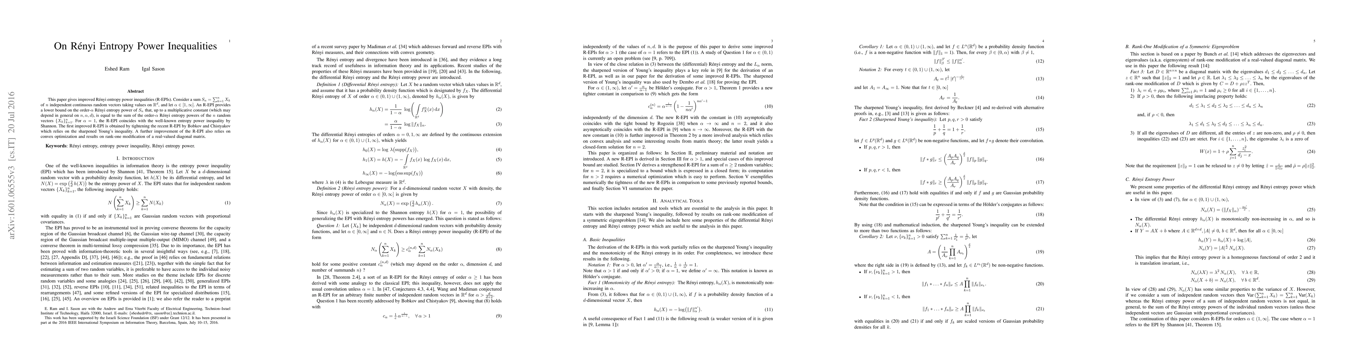 This paper gives improved R\'{e}nyi entropy power inequalities (R-EPIs). Consider a sum $S_n = \sum_{k=1}^n X_k$ of $n$ independent continuous random vectors taking values on $\mathbb{R}^d$, and let $\alpha \in [1, \infty]$. An R-EPI provides a lower bound on the order-$\alpha$ R\'enyi entropy power of $S_n$ that, up to a multiplicative constant (which may depend in general on $n, \alpha, d$), is equal to the sum of the order-$\alpha$ R\'enyi entropy powers of the $n$ random vectors $\{X_k\}_{k=1}^n$. For $\alpha=1$, the R-EPI coincides with the well-known entropy power inequality by Shannon. The first improved R-EPI is obtained by tightening the recent R-EPI by Bobkov and Chistyakov which relies on the sharpened Young's inequality. A further improvement of the R-EPI also relies on convex optimization and results on rank-one modification of a real-valued diagonal matrix.