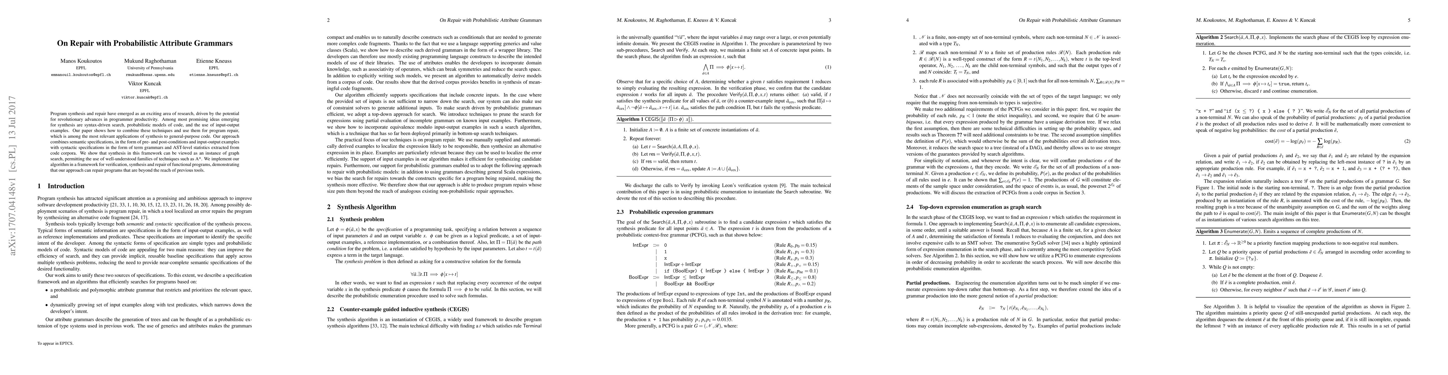 This paper proposes a new approach for program repair using probabilistic attribute grammars, combining semantic and syntactic specifications to improve synthesis accuracy and capabilities. It demonstrates the effectiveness of this method in repairing programs beyond the reach of previous tools.