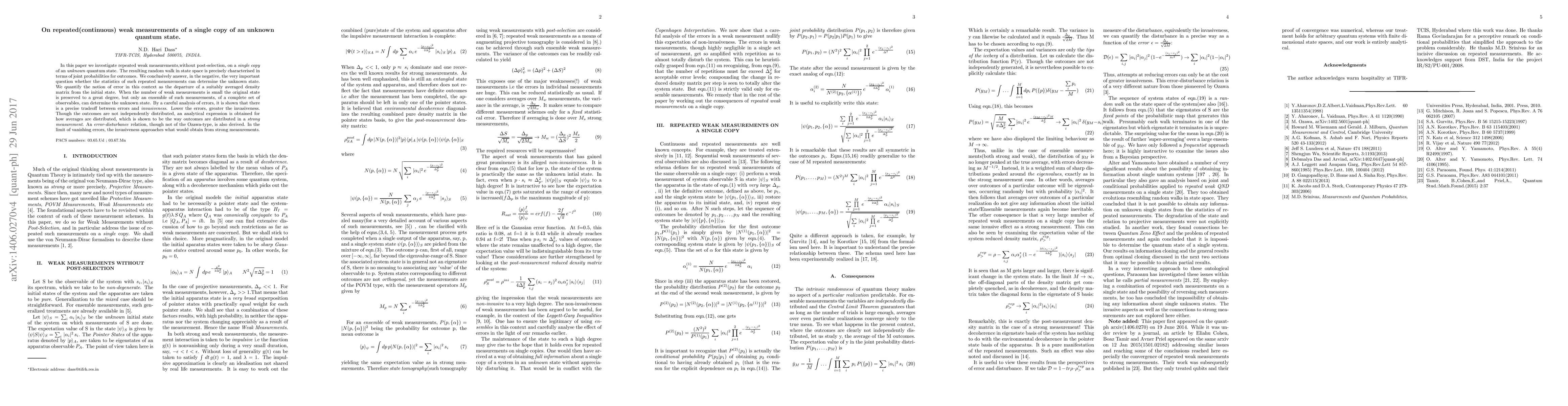 In this paper we investigate repeated weak measurements,without post-selection, on a \emph{single copy} of an \emph{unknown} quantum state. The resulting random walk in state space is precisely characterised in terms of joint probabilities for outcomes. We conclusively answer, in the negative, the very important question whether the statistics of such repeated measurements can determine the unknown state. We quantify the notion of error in this context as the departure of a suitably averaged density matrix from the initial state. When the number of weak measurements is small the original state is preserved to a great degree, but only an ensemble of such measurements, of a complete set of observables, can determine the unknown state. By a careful analysis of errors, it is shown that there is a precise tradeoff between errors and \emph{invasiveness}. Lower the errors, greater the invasiveness. Though the outcomes are not independently distributed, an analytical expression is obtained for how averages are distributed, which is shown to be the way outcomes are distributed in a \emph{strong measurement}. An \emph{error-disturbance} relation, though not of the Ozawa-type, is also derived. In the limit of vanishing errors, the invasiveness approaches what would obtain from strong measurements.