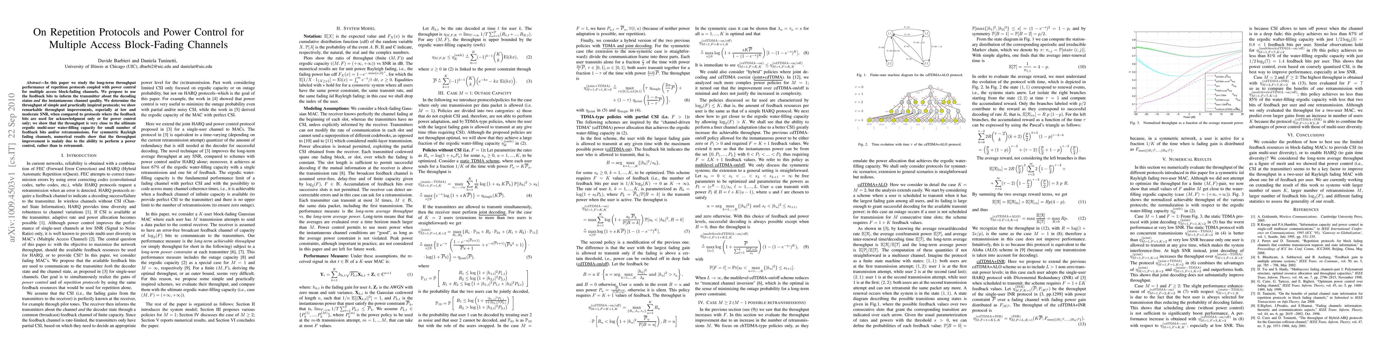 This paper investigates the long-term throughput of repetition protocols with power control for multiple access block-fading channels, demonstrating significant improvements over traditional acknowledgment or power control methods. The use of feedback bits to inform the transmitter about decoding status and channel quality leads to near-optimal throughput, especially at low to moderate SNR levels.