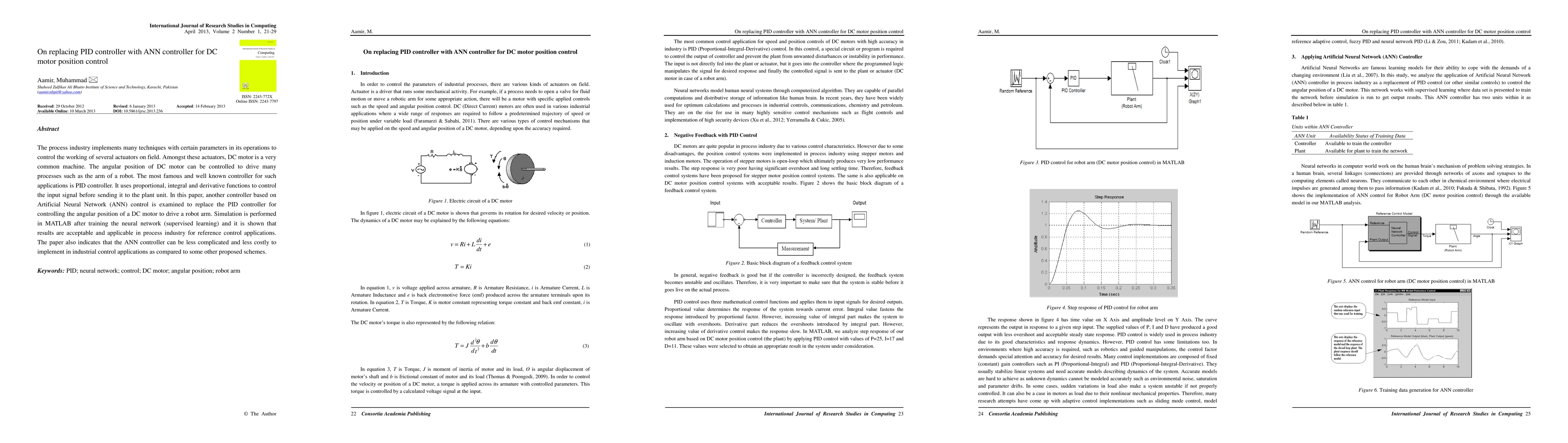 The process industry implements many techniques with certain parameters in its operations to control the working of several actuators on field. Amongst these actuators, DC motor is a very common machine. The angular position of DC motor can be controlled to drive many processes such as the arm of a robot. The most famous and well known controller for such applications is PID controller. It uses proportional, integral and derivative functions to control the input signal before sending it to the plant unit. In this paper, another controller based on Artificial Neural Network (ANN) control is examined to replace the PID controller for controlling the angular position of a DC motor to drive a robot arm. Simulation is performed in MATLAB after training the neural network (supervised learning) and it is shown that results are acceptable and applicable in process industry for reference control applications. The paper also indicates that the ANN controller can be less complicated and less costly to implement in industrial control applications as compared to some other proposed schemes.