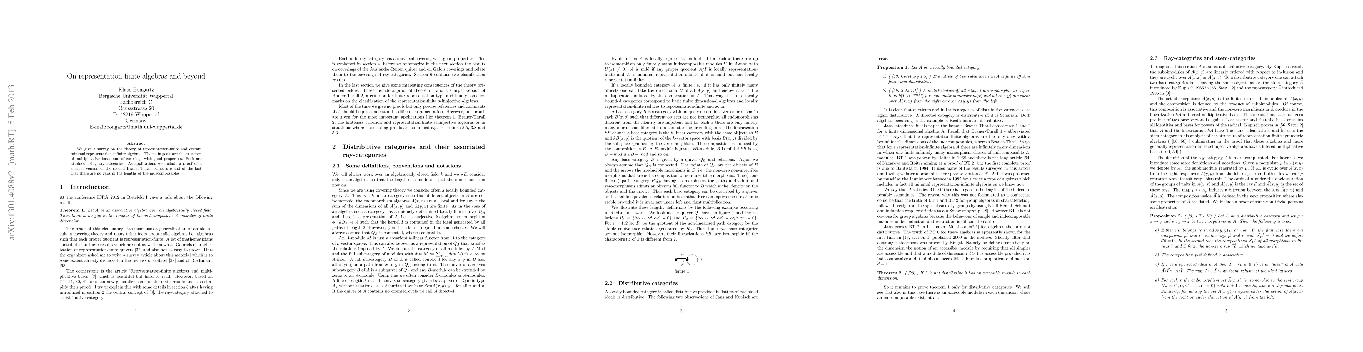 We give a survey on the theory of representation-finite and certain minimal representation-infinite algebras.The main goals are the existence of multiplicative bases and of coverings with good properties. Both are attained via ray-categories. As applications we include a proof of a sharper version of the second Brauer-Thrall conjecture and of the fact that there are no gaps in the lengths of the indecomposable modules over an algebra.