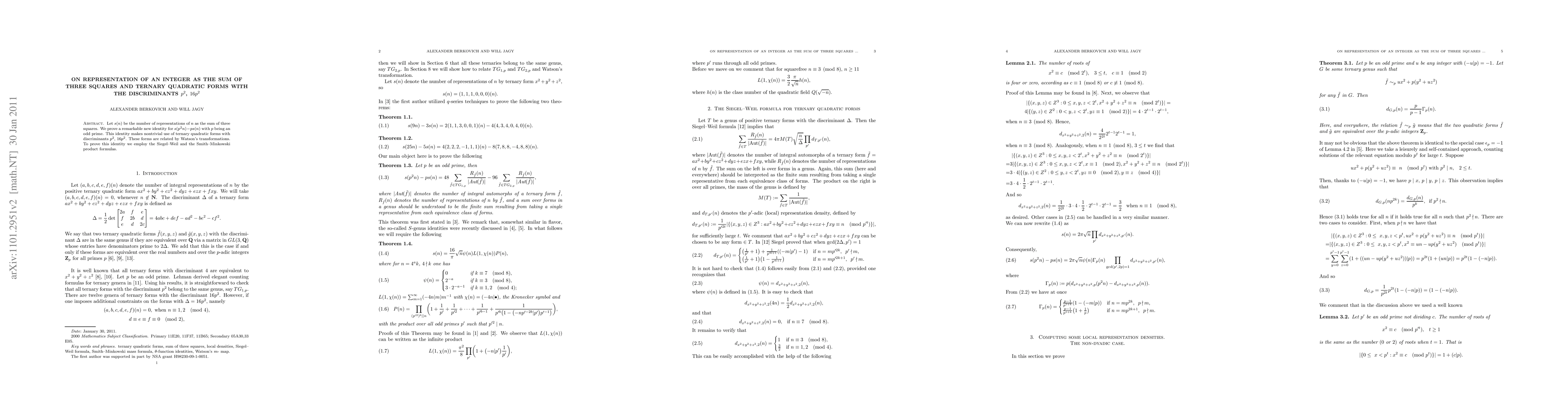 Let s(n) be the number of representations of n as the sum of three squares. We prove a remarkable new identity for s(p^2n)- ps(n) with p being an odd prime. This identity makes nontrivial use of ternary quadratic forms with discriminants p^2 and 16p^2. These forms are related by Watson's transformations. To prove this identity we employ the Siegel--Weil and the Smith--Minkowski product formulas.