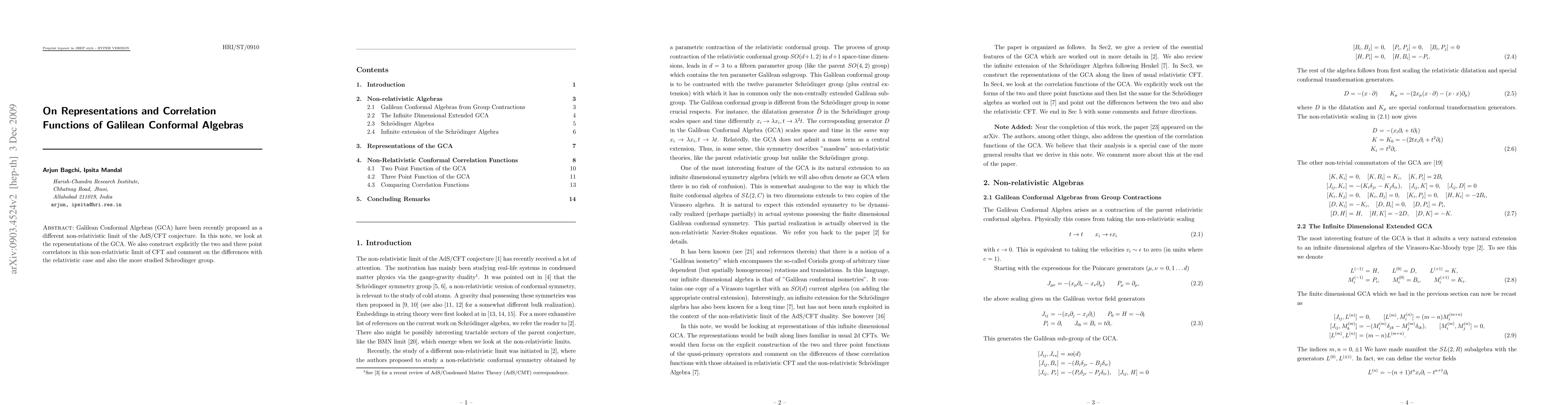Galilean Conformal Algebras (GCA) have been recently proposed as a different non-relativistic limit of the AdS/CFT conjecture. In this note, we look at the representations of the GCA. We also construct explicitly the two and three point correlators in this non-relativistic limit of CFT and comment on the differences with the relativistic case and also the more studied Schrodinger group.