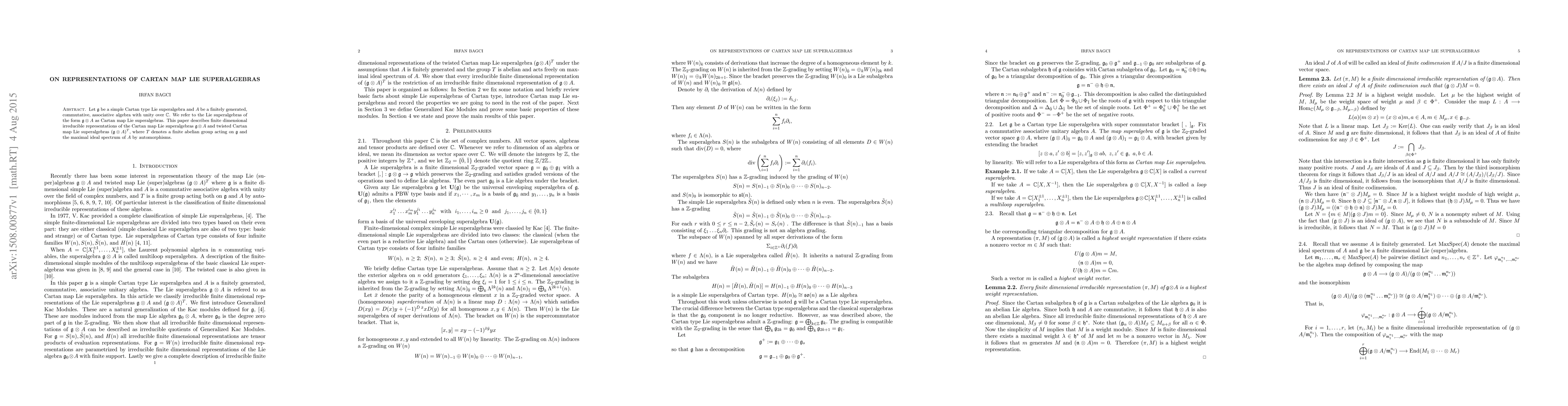 This paper investigates finite-dimensional irreducible representations of Cartan map Lie superalgebras, including both twisted and untwisted forms. The study provides insights into their structural properties and representation theory.