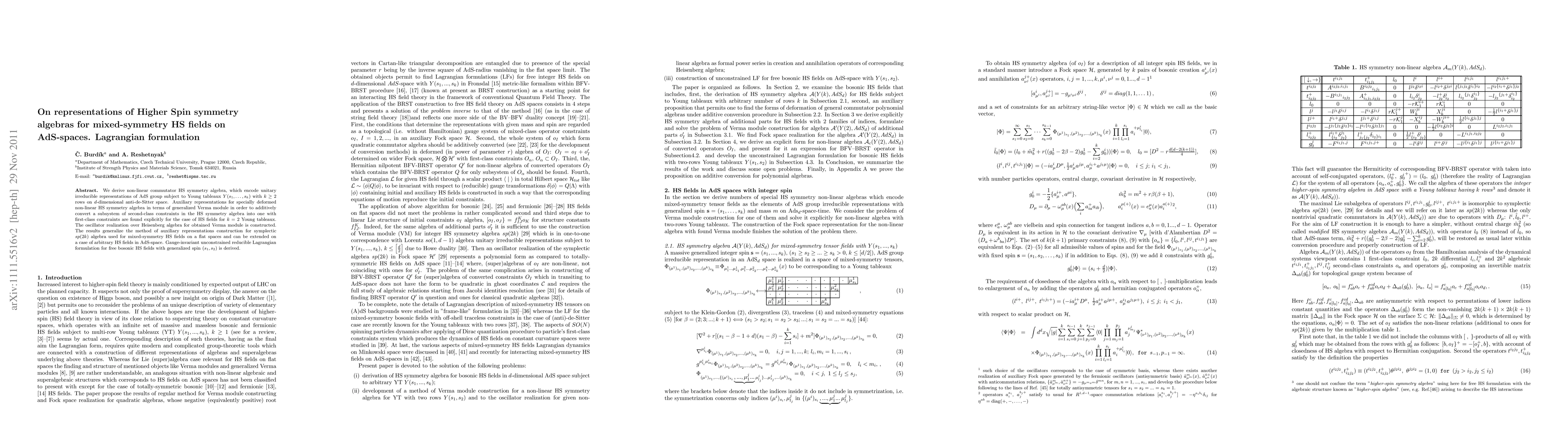 This paper derives the non-linear commutator algebra for Higher Spin symmetry in mixed-symmetry fields on AdS-spaces, constructing auxiliary representations to convert second-class constraints into first-class. A gauge-invariant Lagrangian formulation for free bosonic HS fields with generalized spin is also derived.