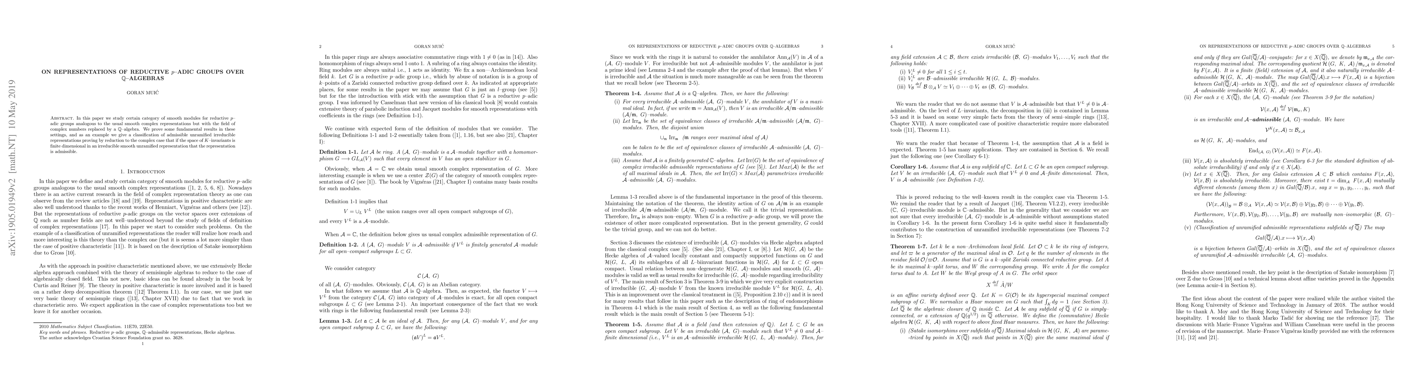 In this paper we study certain category of smooth modules for reductive $p$--adic groups analogous to the usual smooth complex representations but with the field of complex numbers replaced by a $\mathbb Q$--algebra. We prove some fundamental results in these settings, and as an example we give a classification of admissible unramified irreducible representations proving by reduction to the complex case that if the space of $K$--invariants is finite dimensional in an irreducible smooth unramified representation that the representation is admissible.