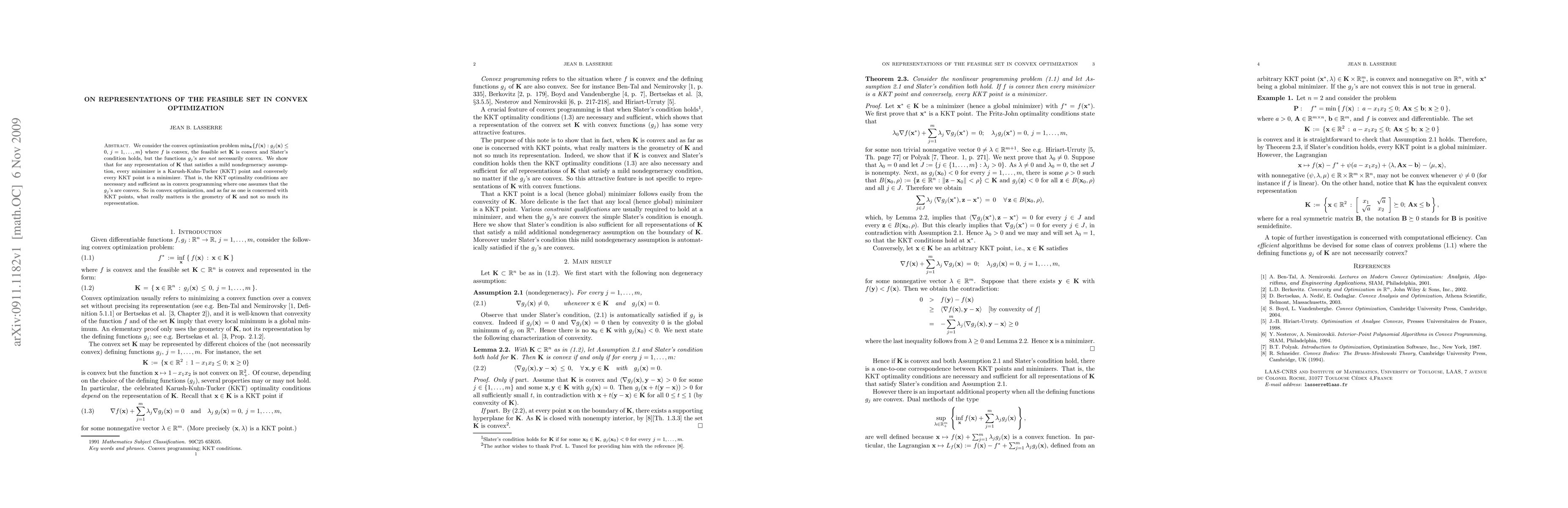 We consider the convex optimization problem $\min \{f(x) : g_j(x)\leq 0, j=1,...,m\}$ where $f$ is convex, the feasible set K is convex and Slater's condition holds, but the functions $g_j$ are not necessarily convex. We show that for any representation of K that satisfies a mild nondegeneracy assumption, every minimizer is a Karush-Kuhn-Tucker (KKT) point and conversely every KKT point is a minimizer. That is, the KKT optimality conditions are necessary and sufficient as in convex programming where one assumes that the $g_j$ are convex. So in convex optimization, and as far as one is concerned with KKT points, what really matters is the geometry of K and not so much its representation.