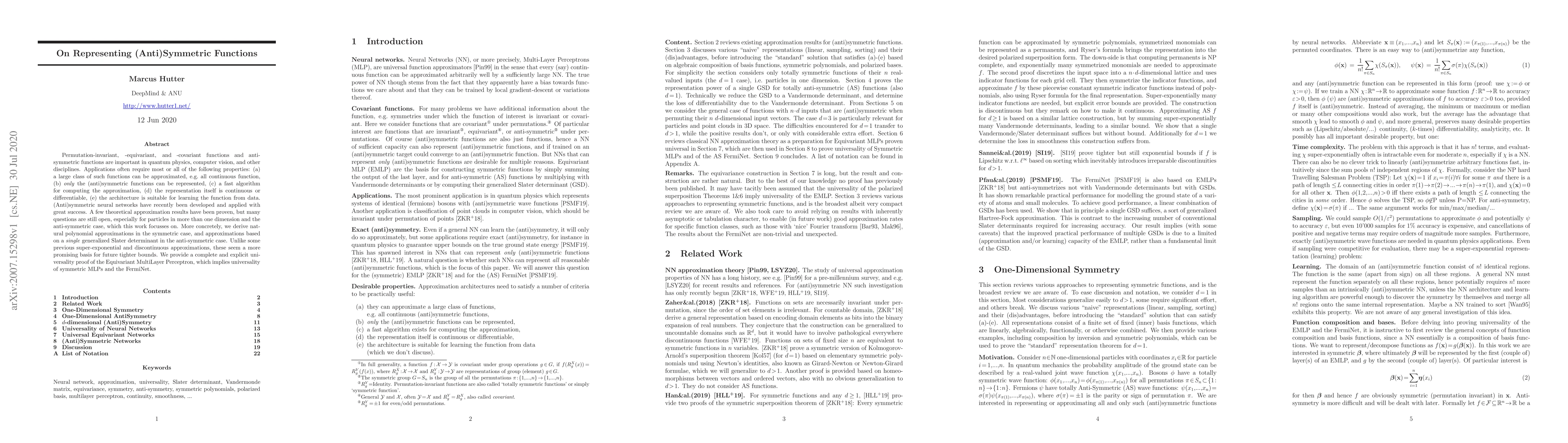 Permutation-invariant, -equivariant, and -covariant functions and anti-symmetric functions are important in quantum physics, computer vision, and other disciplines. Applications often require most or all of the following properties: (a) a large class of such functions can be approximated, e.g. all continuous function, (b) only the (anti)symmetric functions can be represented, (c) a fast algorithm for computing the approximation, (d) the representation itself is continuous or differentiable, (e) the architecture is suitable for learning the function from data. (Anti)symmetric neural networks have recently been developed and applied with great success. A few theoretical approximation results have been proven, but many questions are still open, especially for particles in more than one dimension and the anti-symmetric case, which this work focusses on. More concretely, we derive natural polynomial approximations in the symmetric case, and approximations based on a single generalized Slater determinant in the anti-symmetric case. Unlike some previous super-exponential and discontinuous approximations, these seem a more promising basis for future tighter bounds. We provide a complete and explicit universality proof of the Equivariant MultiLayer Perceptron, which implies universality of symmetric MLPs and the FermiNet.