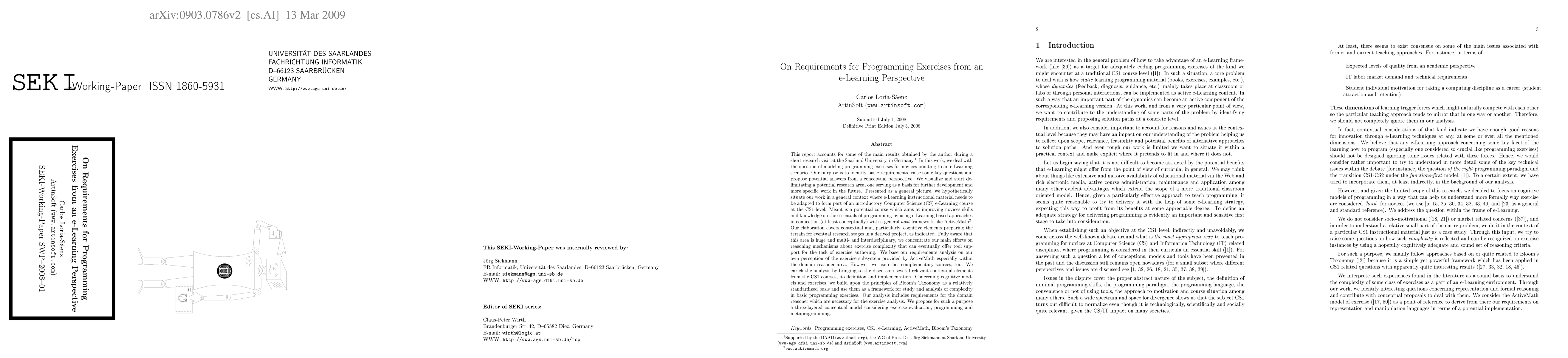 In this work, we deal with the question of modeling programming exercises for novices pointing to an e-learning scenario. Our purpose is to identify basic requirements, raise some key questions and propose potential answers from a conceptual perspective. Presented as a general picture, we hypothetically situate our work in a general context where e-learning instructional material needs to be adapted to form part of an introductory Computer Science (CS) e-learning course at the CS1-level. Meant is a potential course which aims at improving novices skills and knowledge on the essentials of programming by using e-learning based approaches in connection (at least conceptually) with a general host framework like Activemath (www.activemath.org). Our elaboration covers contextual and, particularly, cognitive elements preparing the terrain for eventual research stages in a derived project, as indicated. We concentrate our main efforts on reasoning mechanisms about exercise complexity that can eventually offer tool support for the task of exercise authoring. We base our requirements analysis on our own perception of the exercise subsystem provided by Activemath especially within the domain reasoner area. We enrich the analysis by bringing to the discussion several relevant contextual elements from the CS1 courses, its definition and implementation. Concerning cognitive models and exercises, we build upon the principles of Bloom's Taxonomy as a relatively standardized basis and use them as a framework for study and analysis of complexity in basic programming exercises. Our analysis includes requirements for the domain reasoner which are necessary for the exercise analysis. We propose for such a purpose a three-layered conceptual model considering exercise evaluation, programming and metaprogramming.