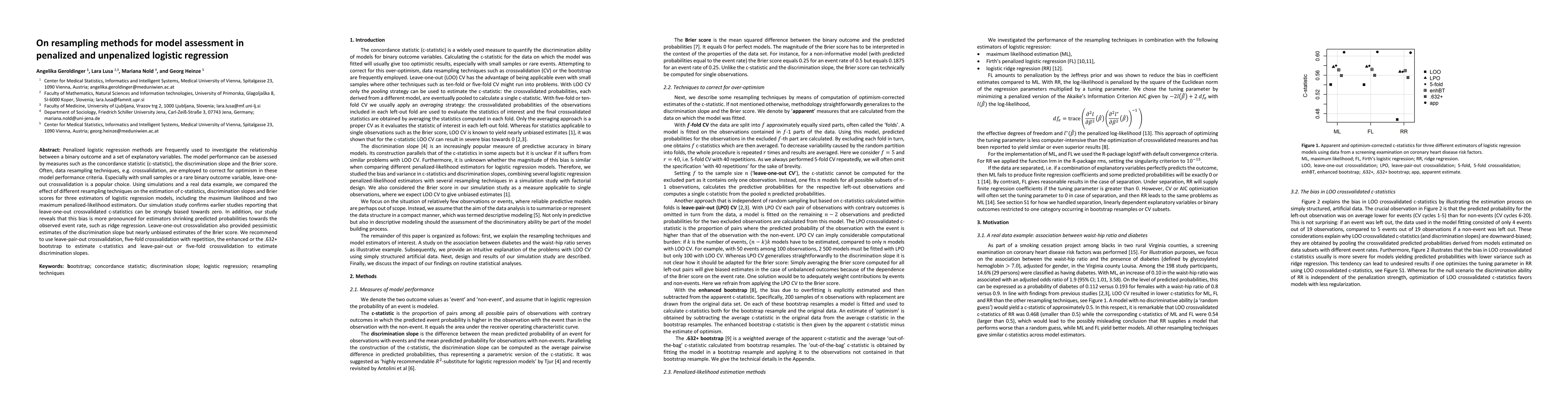 This paper evaluates the impact of various resampling methods on model assessment in penalized and unpenalized logistic regression, finding that leave-one-out crossvalidation can be biased, especially for penalized estimators. It recommends alternative methods like leave-pair-out crossvalidation and five-fold crossvalidation for more accurate performance estimation.
