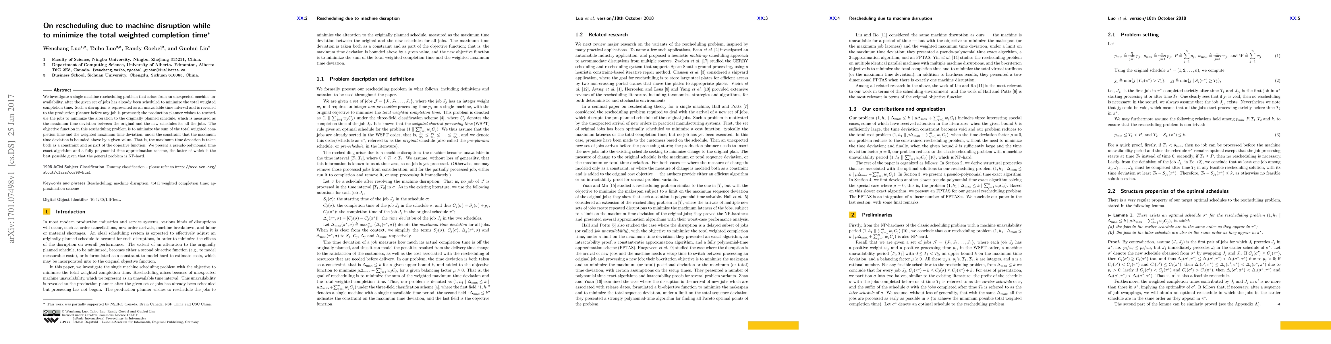 This paper addresses a single machine rescheduling problem caused by unexpected machine unavailability, aiming to minimize the total weighted completion time and the maximum time deviation from the original schedule. It presents an exact algorithm and an optimal approximation scheme for this NP-hard problem.