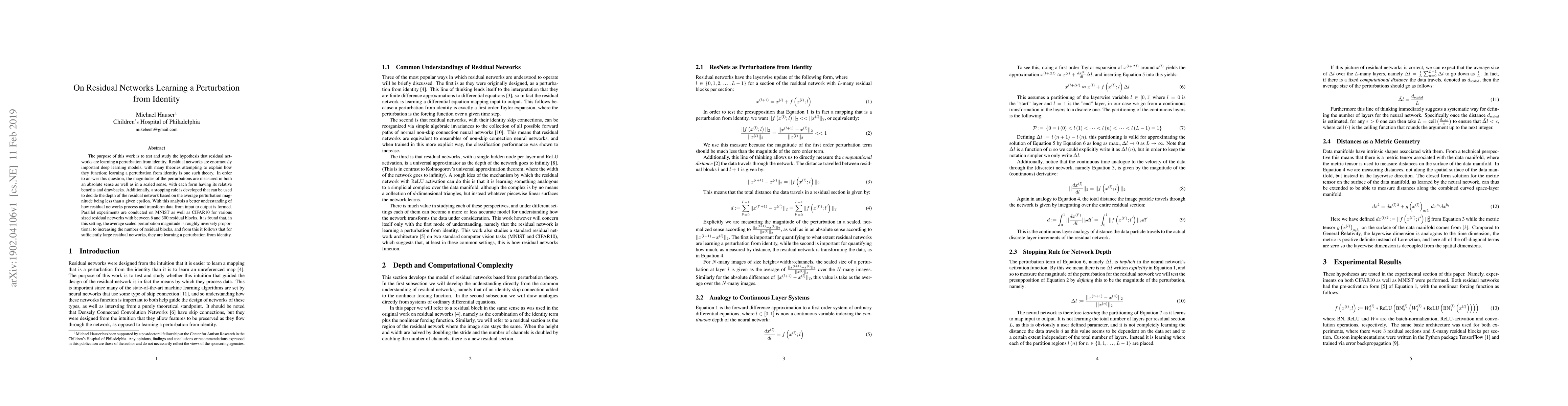 This paper investigates whether residual networks learn a perturbation from identity, finding that larger networks tend to learn such perturbations, with the average scaled perturbation magnitude inversely proportional to the number of residual blocks. A stopping rule based on perturbation magnitude is also developed to determine network depth.