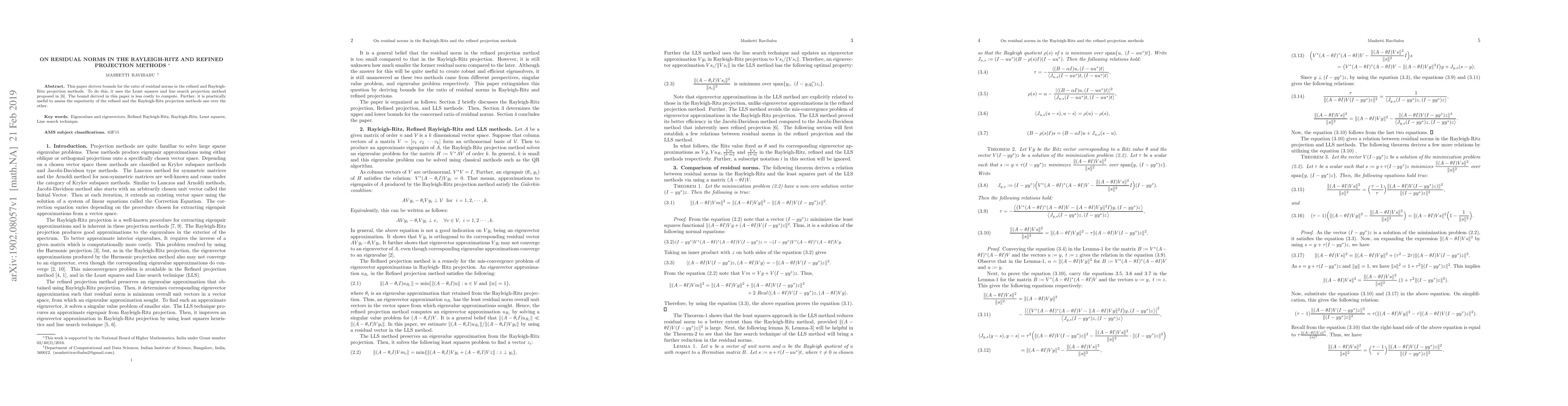 This paper derives computationally efficient bounds for the residual norms in refined and Rayleigh-Ritz projection methods, providing a practical tool to assess their relative effectiveness. The derived bounds utilize the Least squares and line search projection method.