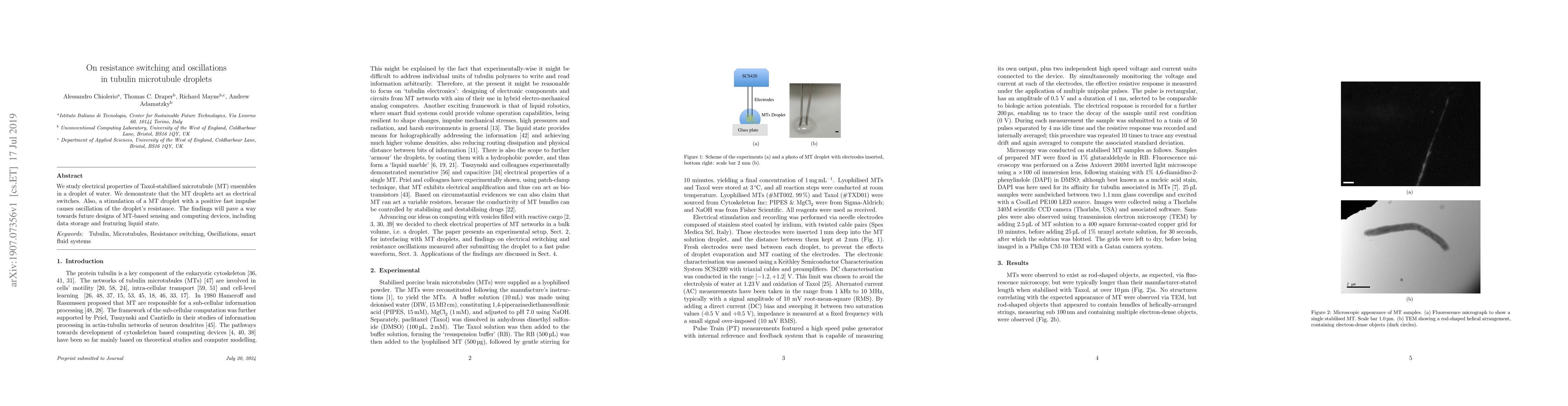 We study electrical properties of Taxol-stabilised microtubule (MT) ensembles in a droplet of water. We demonstrate that the MT droplets act as electrical switches. Also, a stimulation of a MT droplet with a positive fast impulse causes oscillation of the droplet's resistance. The findings will pave a way towards future designs of MT-based sensing and computing devices, including data storage and featuring liquid state.