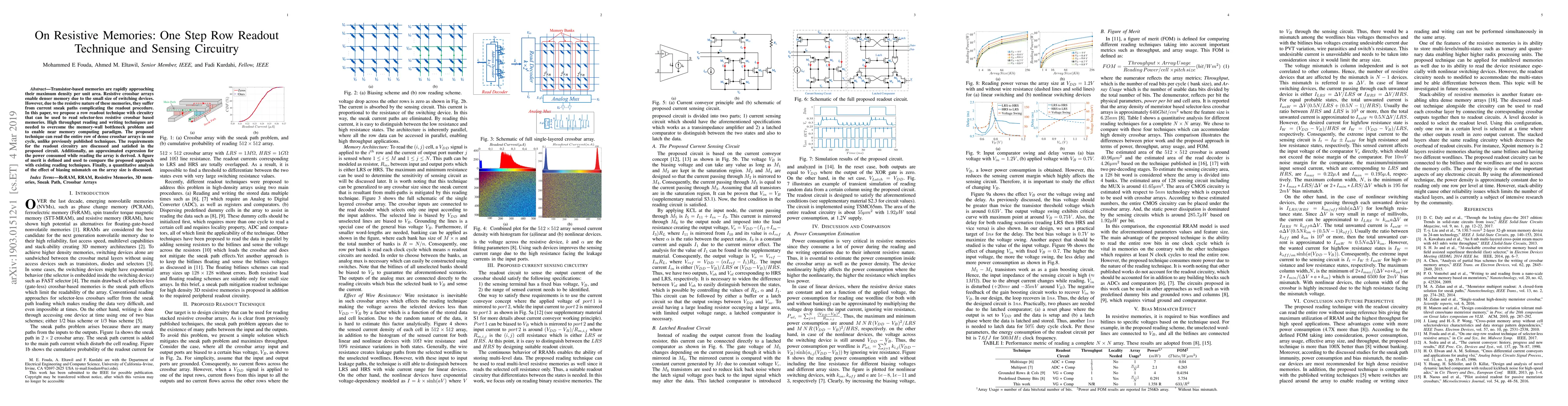 This paper proposes a novel one-step row readout technique and associated circuitry for dense resistive crossbar memories, enabling high throughput reading in a single cycle to address the memory-wall bottleneck. The proposed method also defines a figure of merit for power consumption and analyzes biasing mismatch effects.