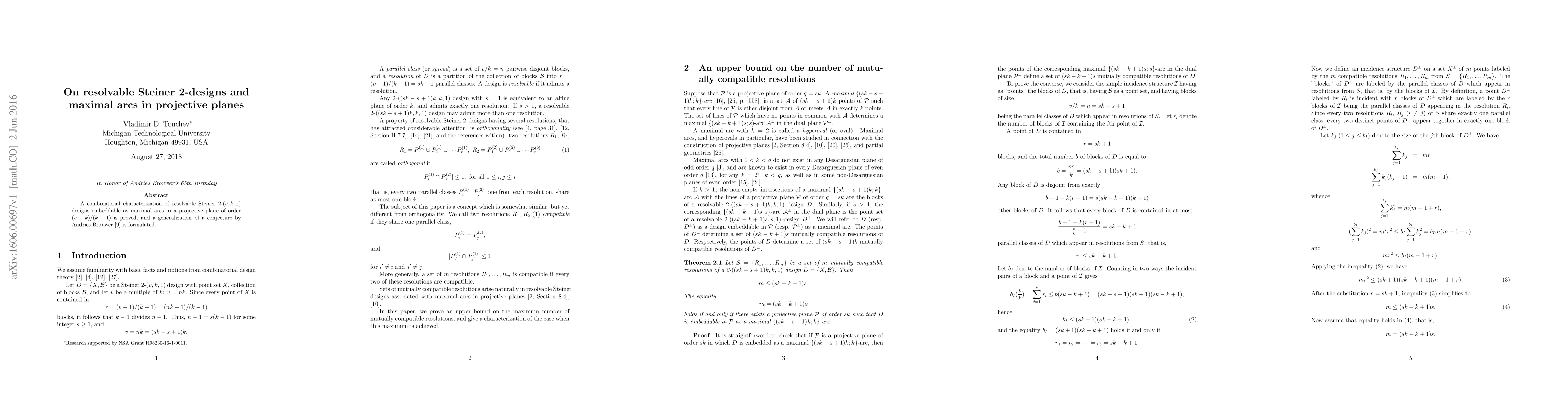 A combinatorial characterization of resolvable Steiner 2-$(v,k,1)$ designs embeddable as maximal arcs in a projective plane of order $(v-k)/(k-1)$ is proved, and a generalization of a conjecture by Andries Brouwer \cite{Br} is formulated.