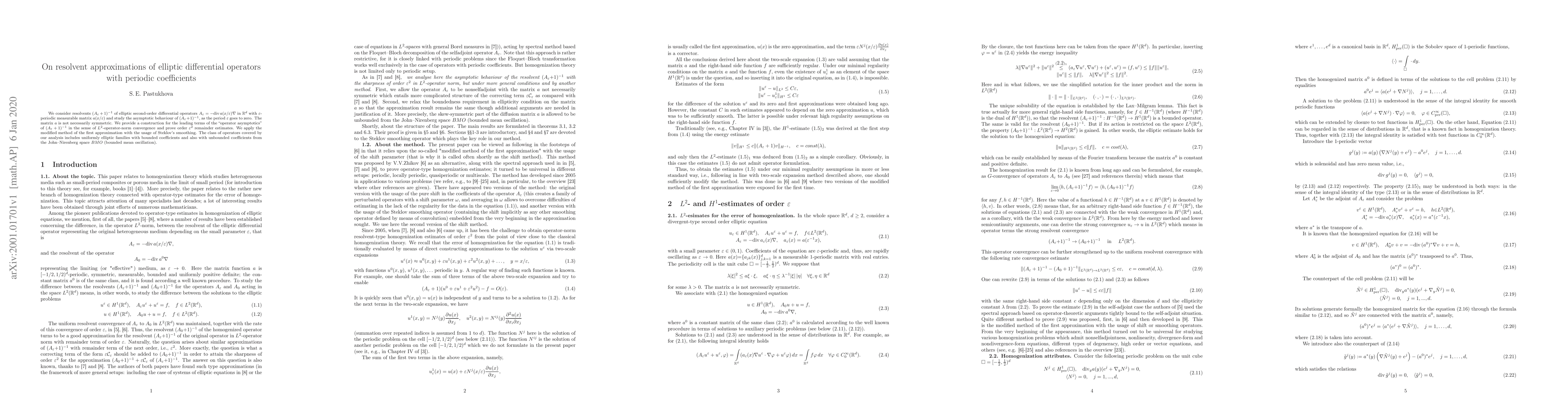 Two-line summary: This paper investigates resolvent approximations for elliptic differential operators with periodic coefficients, focusing on both bounded and $BMO$ coefficient cases. The authors utilize the modified method of the first approximation, incorporating Steklov's smoothing, to analyze these operators in the limit of small periods.