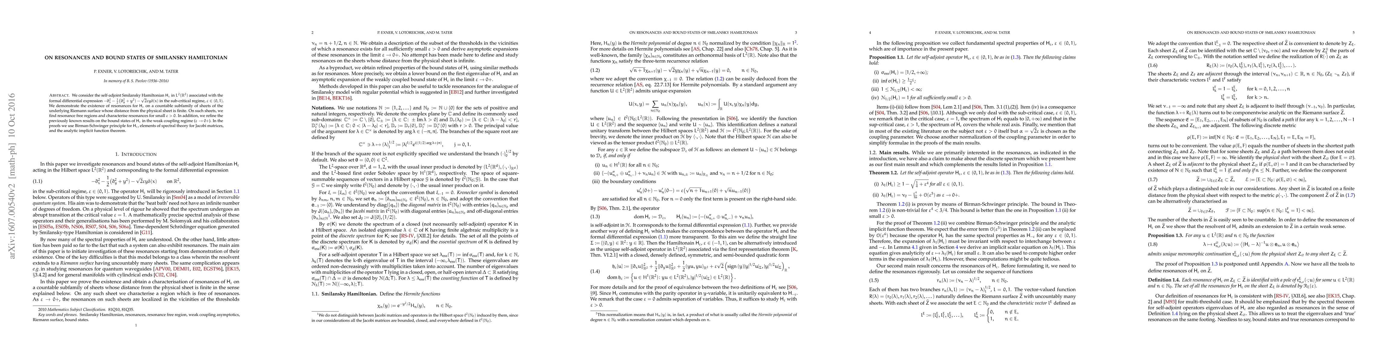 We consider the self-adjoint Smilansky Hamiltonian $\mathsf{H}_\varepsilon$ in $L^2(\mathbb{R}^2)$ associated with the formal differential expression $-\partial_x^2 - \frac12\big(\partial_y^2 + y^2) - \sqrt{2}\varepsilon y \delta(x)$ in the sub-critical regime, $\varepsilon \in (0,1)$. We demonstrate the existence of resonances for $\mathsf{H}_\varepsilon$ on a countable subfamily of sheets of the underlying Riemann surface whose distance from the physical sheet is finite. On such sheets, we find resonance free regions and characterise resonances for small $\varepsilon > 0$. In addition, we refine the previously known results on the bound states of $\mathsf{H}_\varepsilon$ in the weak coupling regime ($\varepsilon\rightarrow 0+$). In the proofs we use Birman-Schwinger principle for $\mathsf{H}_\varepsilon$, elements of spectral theory for Jacobi matrices, and the analytic implicit function theorem.