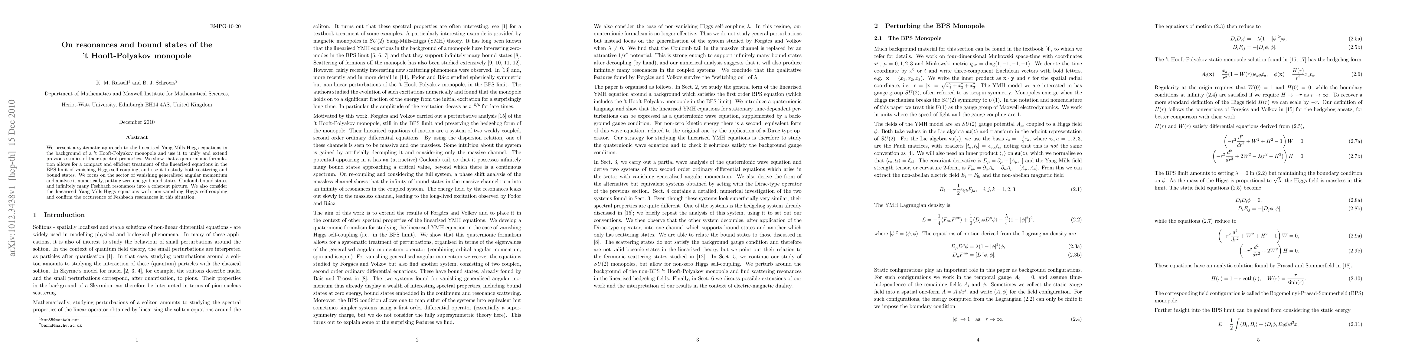 We present a systematic approach to the linearised Yang-Mills-Higgs equations in the background of a 't Hooft-Polyakov monopole and use it to unify and extend previous studies of their spectral properties. We show that a quaternionic formulation allows for a compact and efficient treatment of the linearised equations in the BPS limit of vanishing Higgs self-coupling, and use it to study both scattering and bound states. We focus on the sector of vanishing generalised angular momentum and analyse it numerically, putting zero-energy bound states, Coulomb bound states and infinitely many Feshbach resonances into a coherent picture. We also consider the linearised Yang-Mills-Higgs equations with non-vanishing Higgs self-coupling and confirm the occurrence of Feshbach resonances in this situation.