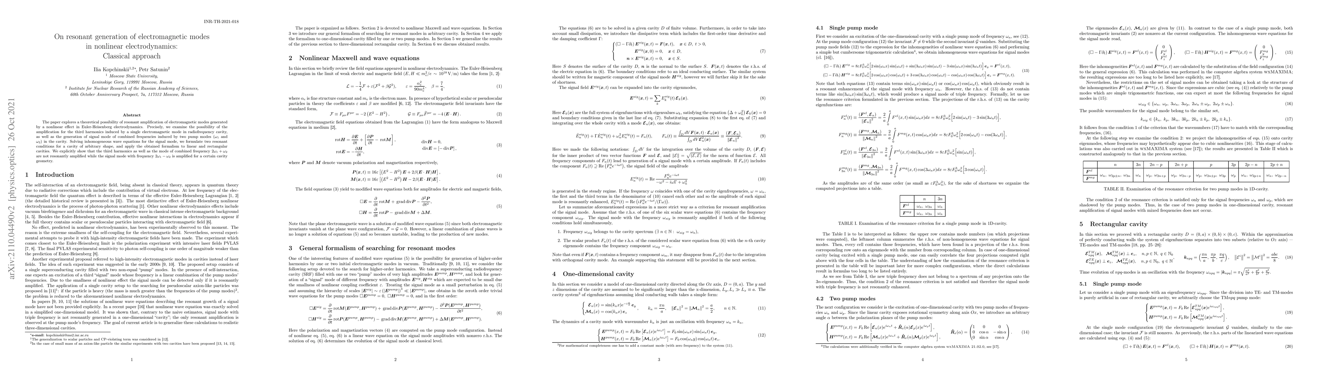 This paper investigates resonant amplification of electromagnetic modes in nonlinear electrodynamics, specifically focusing on third harmonics and combined frequency signals in radiofrequency cavities. It derives two resonant conditions for arbitrary cavity shapes and demonstrates that while third harmonics and combined frequency modes are not amplified, a signal mode with frequency $2\omega_1 - \omega_2$ can be resonantly amplified under specific conditions.