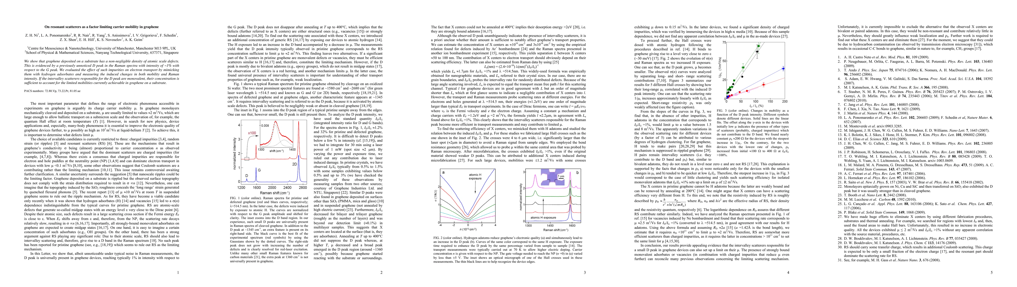 This paper demonstrates that atomic scale defects in graphene deposited on a substrate significantly limit carrier mobility, evidenced by a D peak in Raman spectra. The study finds that monovalent impurities, modeled by hydrogen adsorbates, sufficiently account for the observed mobility limitations.